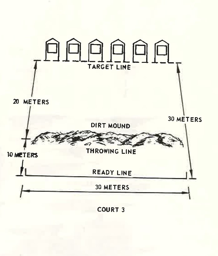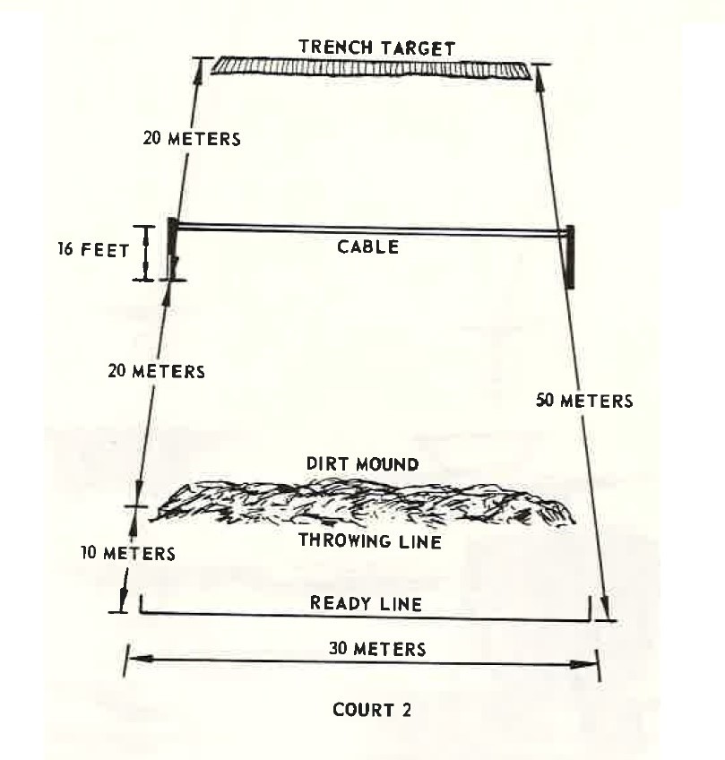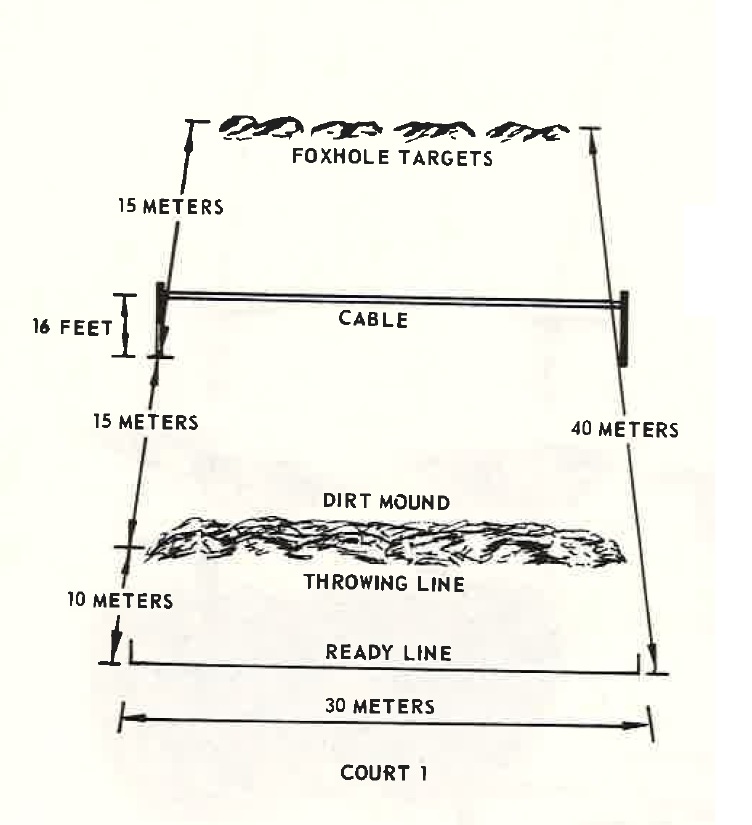 This court is 30-meters wide and 40-meters deep. It consists of a ready line, a throwing line, from which soldiers throw grenades from the standing position, and a cable which is suspended 4.5 meters (16-feet) high across the court and 1'5 meters forward of the throwing line. Six foxhole targets are located 30 meters across the court from the throwing line.