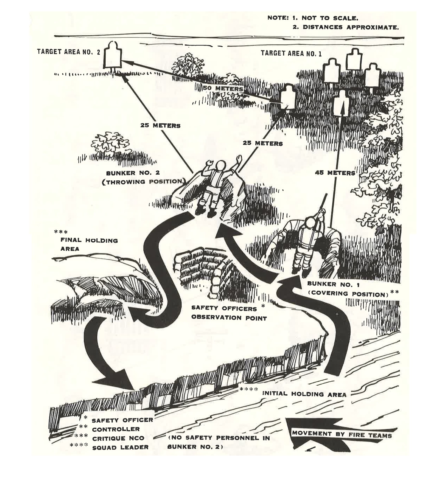 The range used for the conduct of this course consists of two separate areas, each consisting of an assembly area, a final coordination line, an initial holding area, a covering position, a throwing position, a final holding area, a safety officer's observation point, and two target areas. The physical layout of the course is illustrated in figure 37.