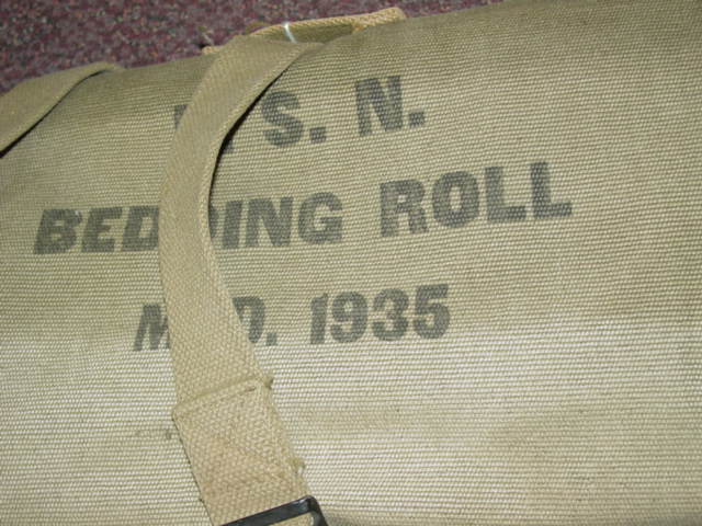 The front of the bedroll is black ink marked with "USN" and the words "Bedding Roll Mod 1935".