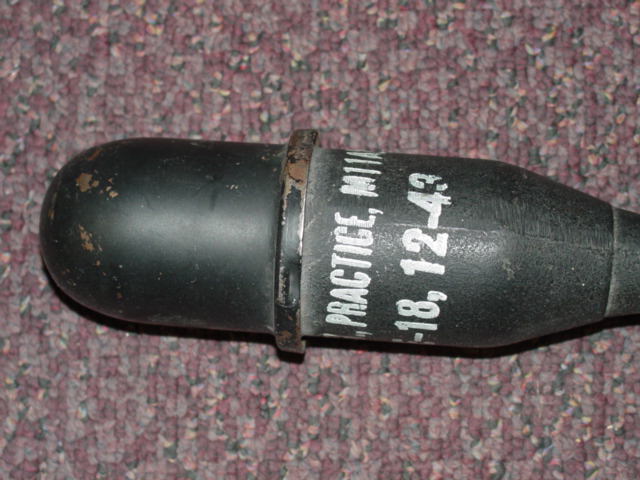 inserted. The head of the grenade has white paint stenciled letters that read: