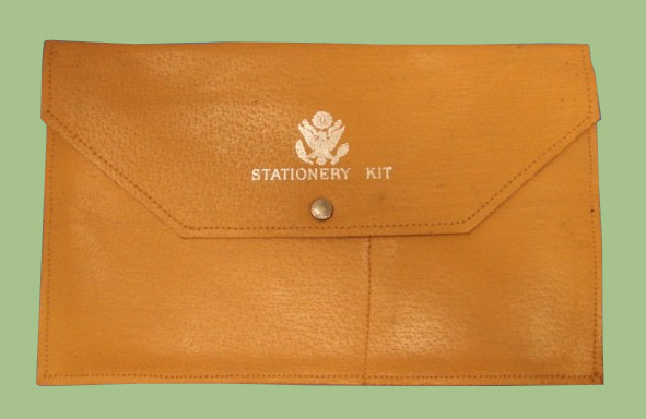 This is a stationary set kit. Of leather construction. Khaki color. Single snap closure.