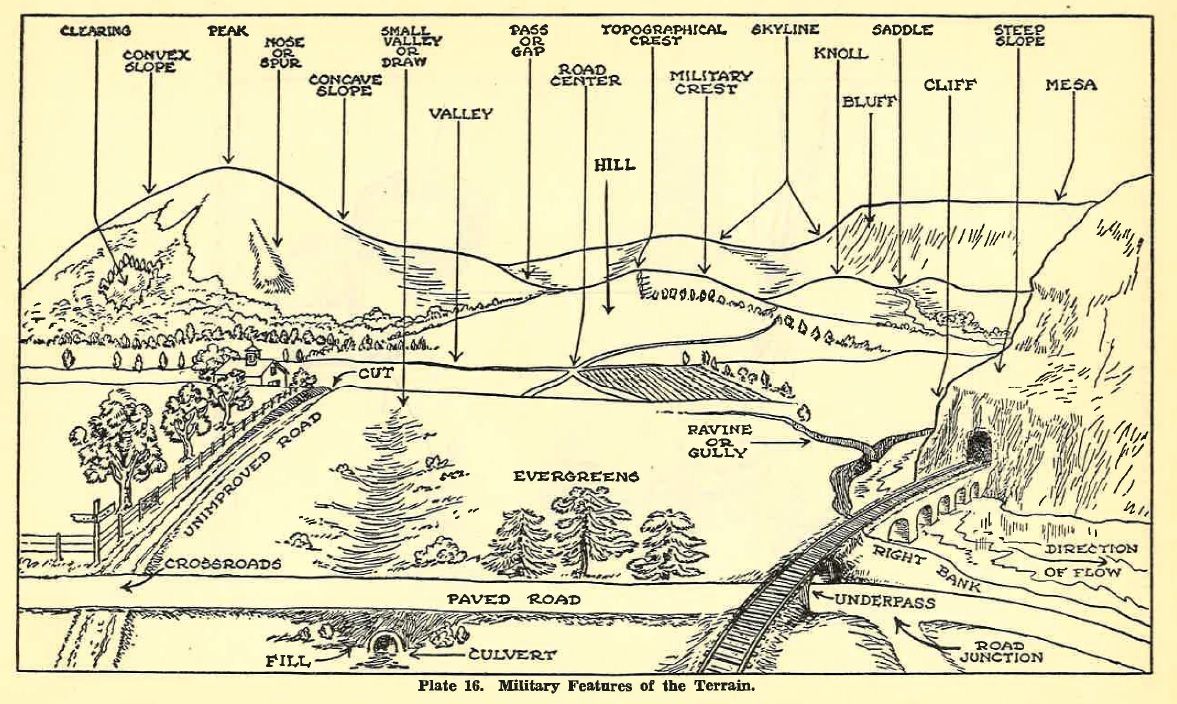 | 2. | In your own words describe what you understand the following terrain features to be: crest, ridge, ravine, draw, saddle, gentle slope, clearing, cut. fig. ll. |