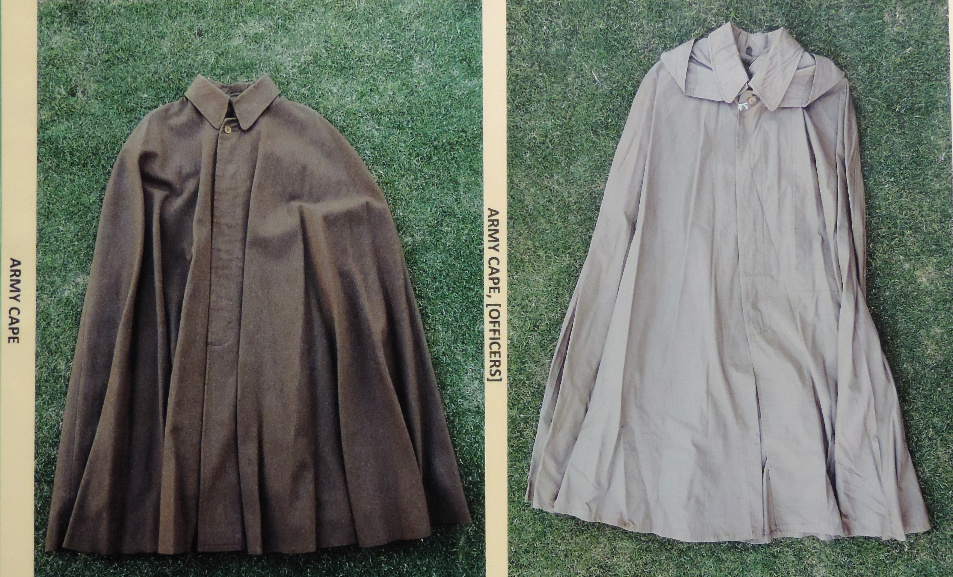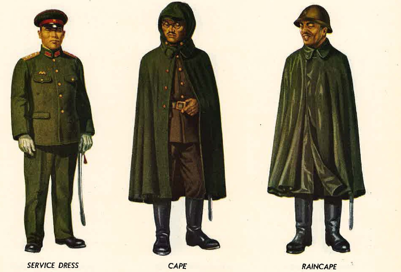 Officers wear overcoats of similar design, but have sleeve insignia consisting of l, 2, or 3 stripes of dark-brown braid qn or above the cuff to indicate company, field or general officers' grades respectively. Sometimes service dress capes also are worn by officers. All overcoats and capes are equipped with detachable hoods which button on The throat piece, which gives good c1osure across the neck, carries 2 or 3 strips as an indication of company, field, or general officer ranks.