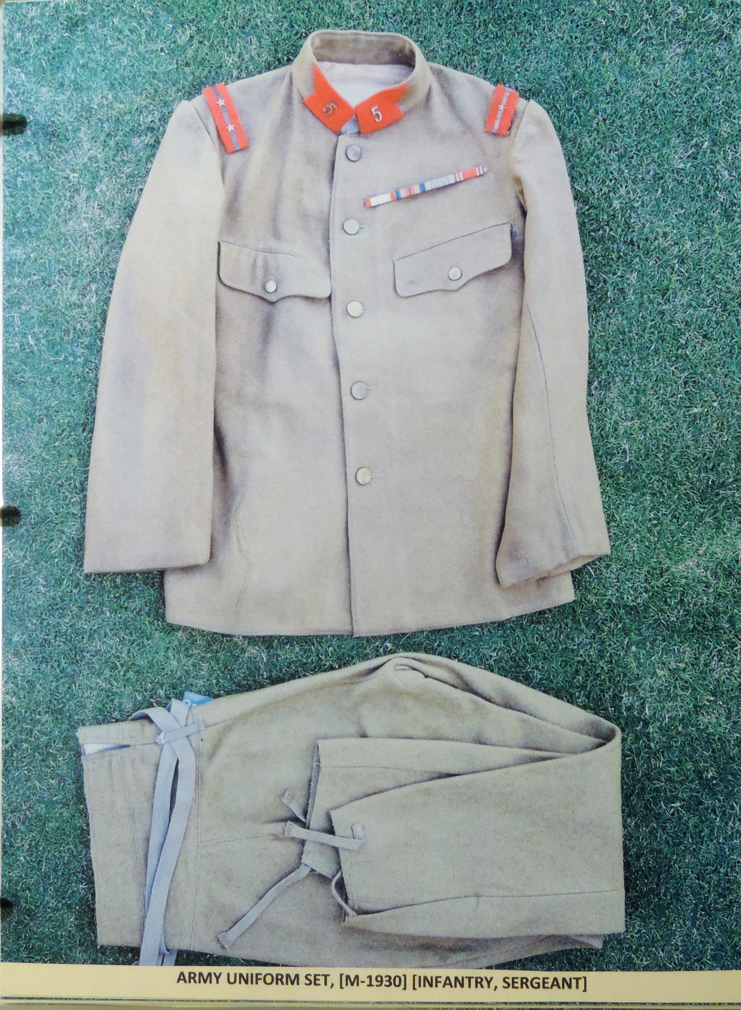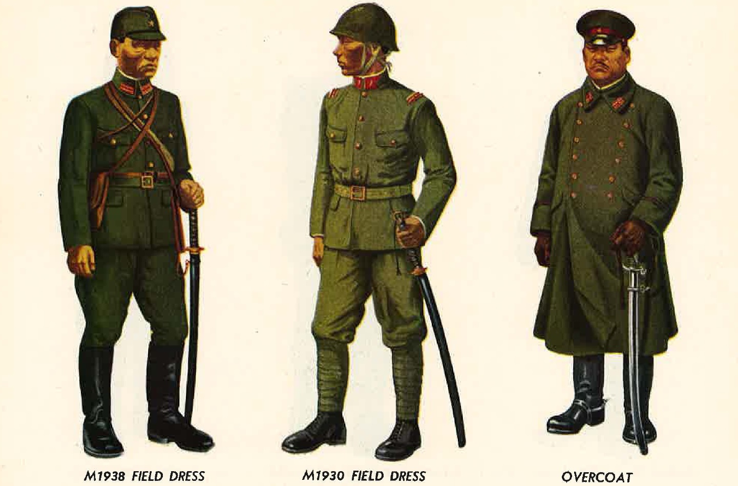 The older typ M-1930 uniform is still worn by some Japanese soldiers, is made of heavy, mustard-colored, woolen cloth. The coat is not unlike the American coat of World War I. It has a high stand-up collar, to which the insignia of arm and unit are attached except when in the field.