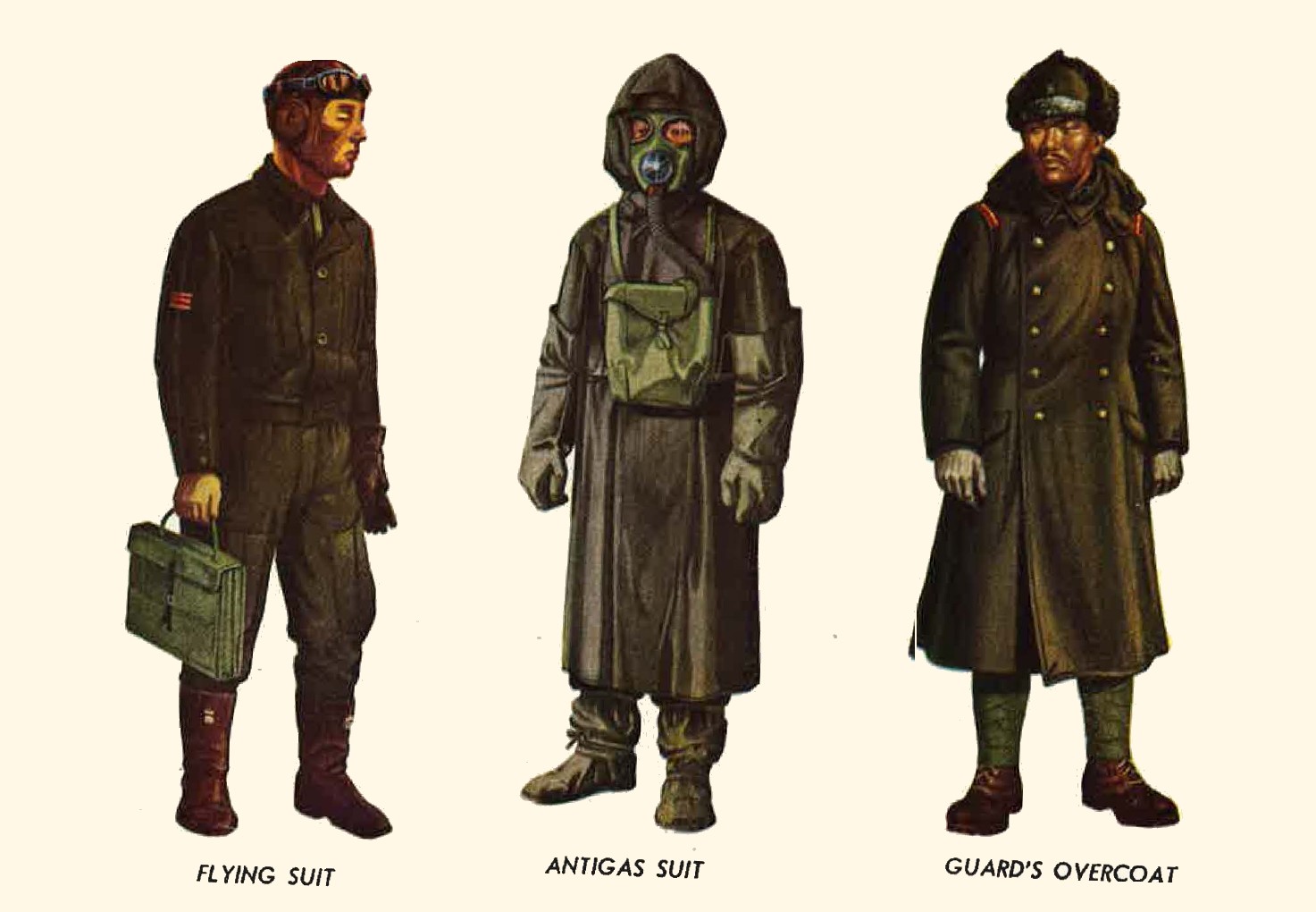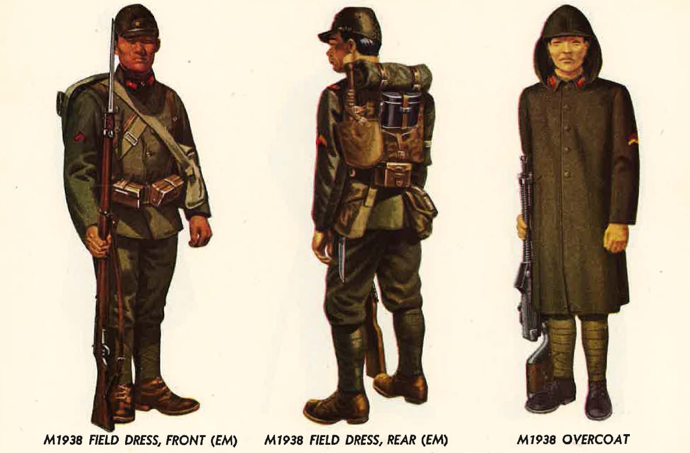 The newer type M-1938 uniform is olive drab in color and is made either of cotton or wool, depending on the season. The coat has a turn-down collar and four pockets with flaps.