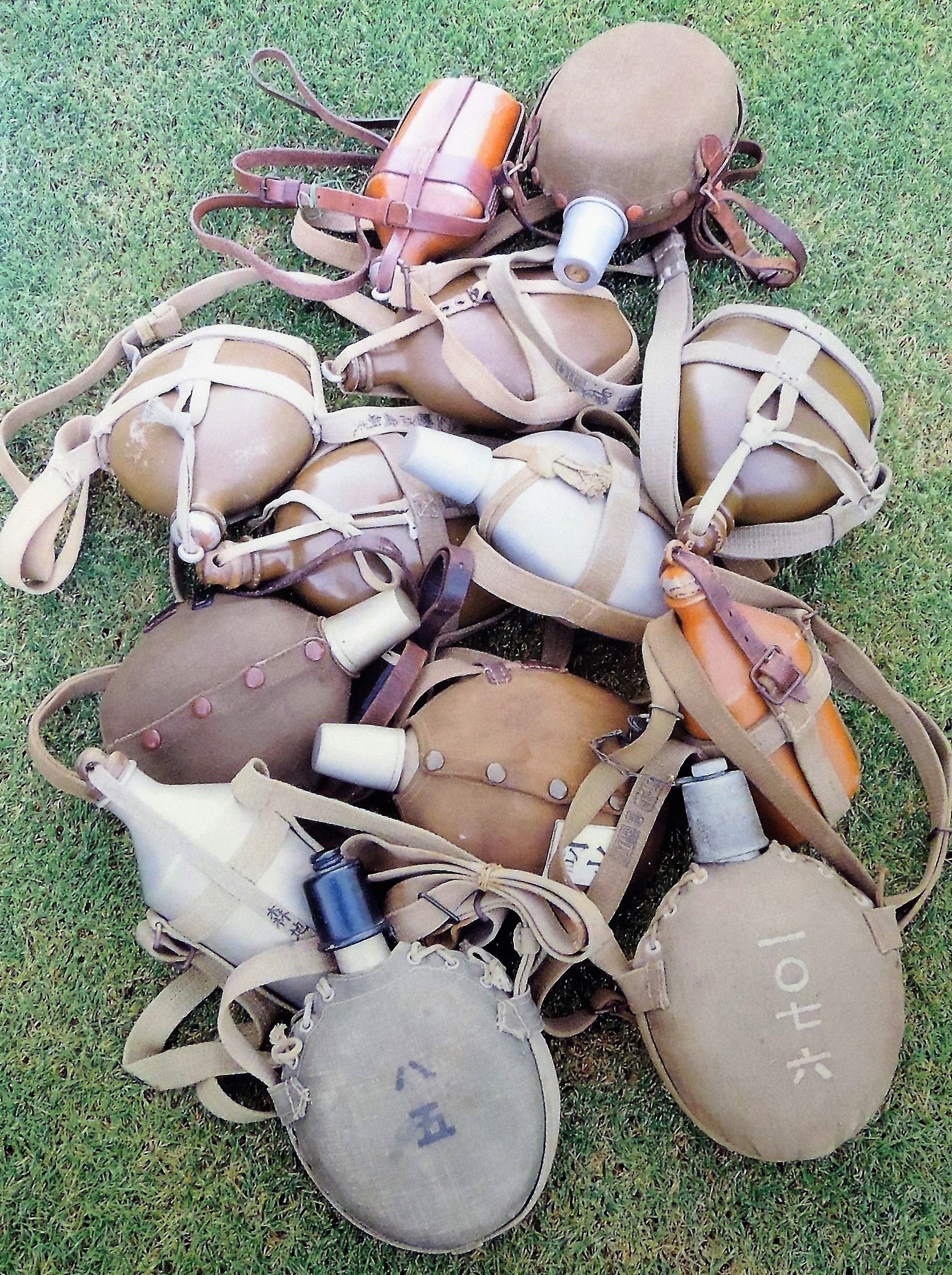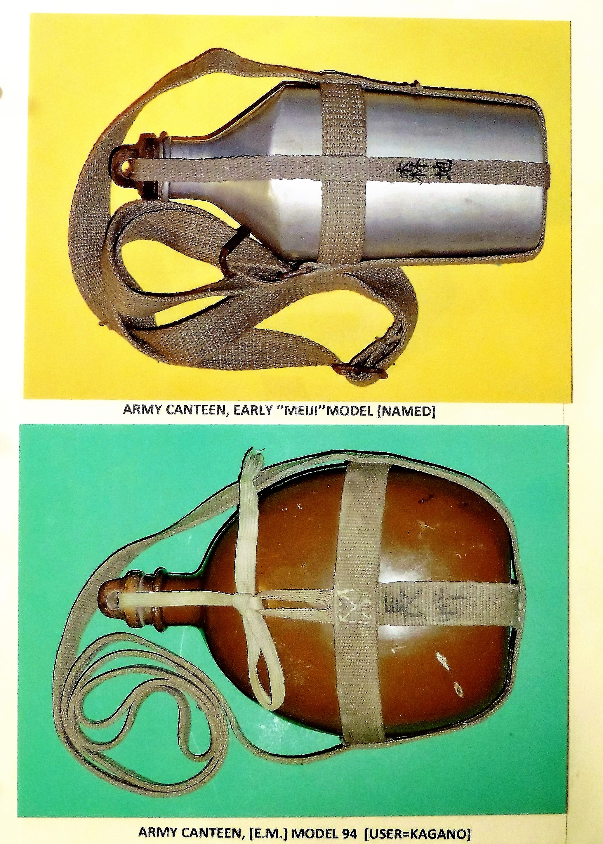 ![]() Figure 21. TOP - Army canteen early "Meiji" model (Named). BOTTOM - Army canteen, enlisted man, Model 94, (Named). |