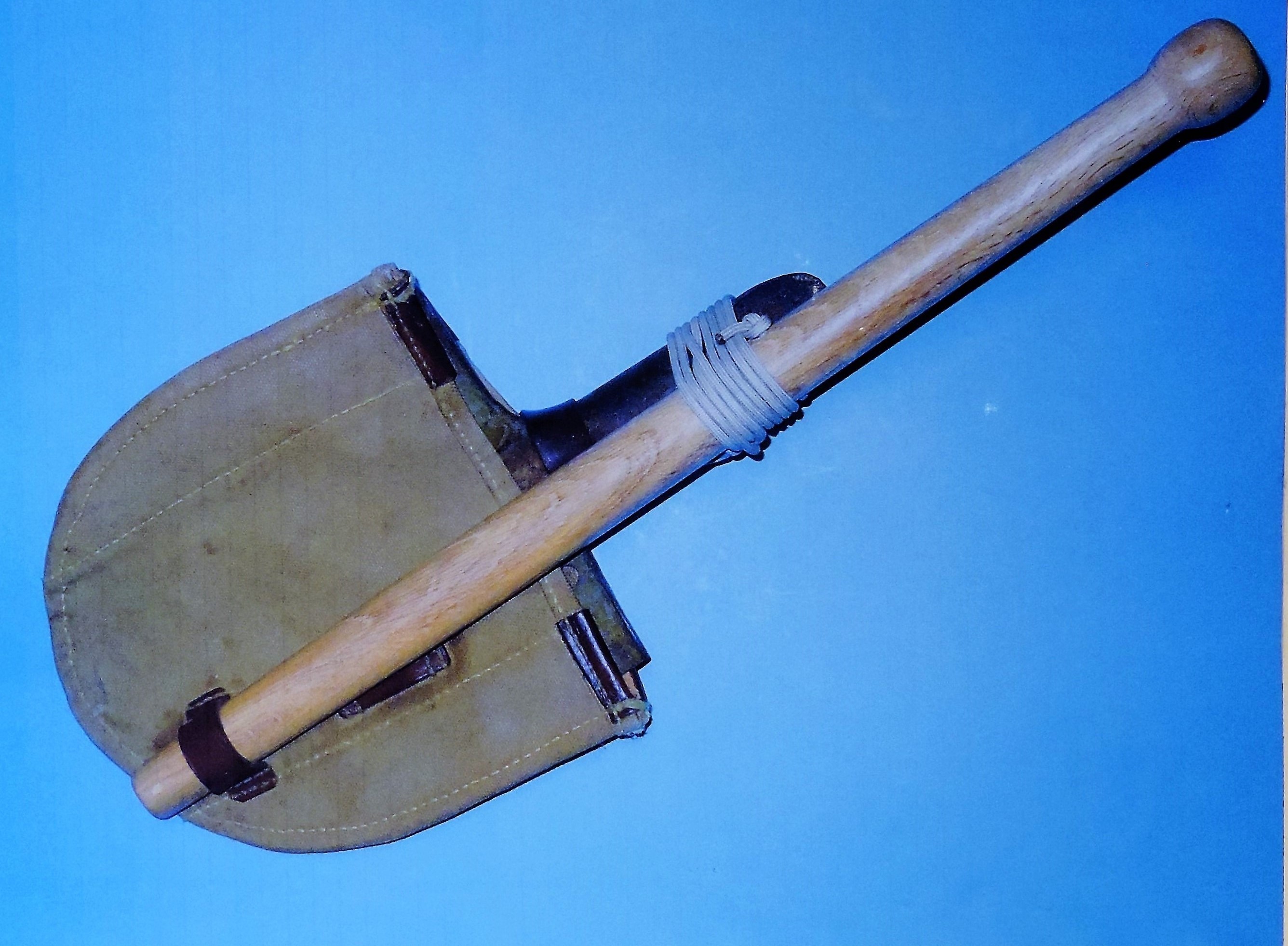 The canteen, which hangs from a shoulder strap and rests on the right hip in a network of webbing straps, is made of aluminum and painted brown. There are 1 pint and 2½ pint sizes. The web straps were made of canvas. The center piece had a leather strap sewn in place which was used to secure the cap of the canteen. It was relatively common for the soldier to write his name on the canteen webbing. In the earlier examples the webbing was made of leather, which did not perform as well in the jungle environment.