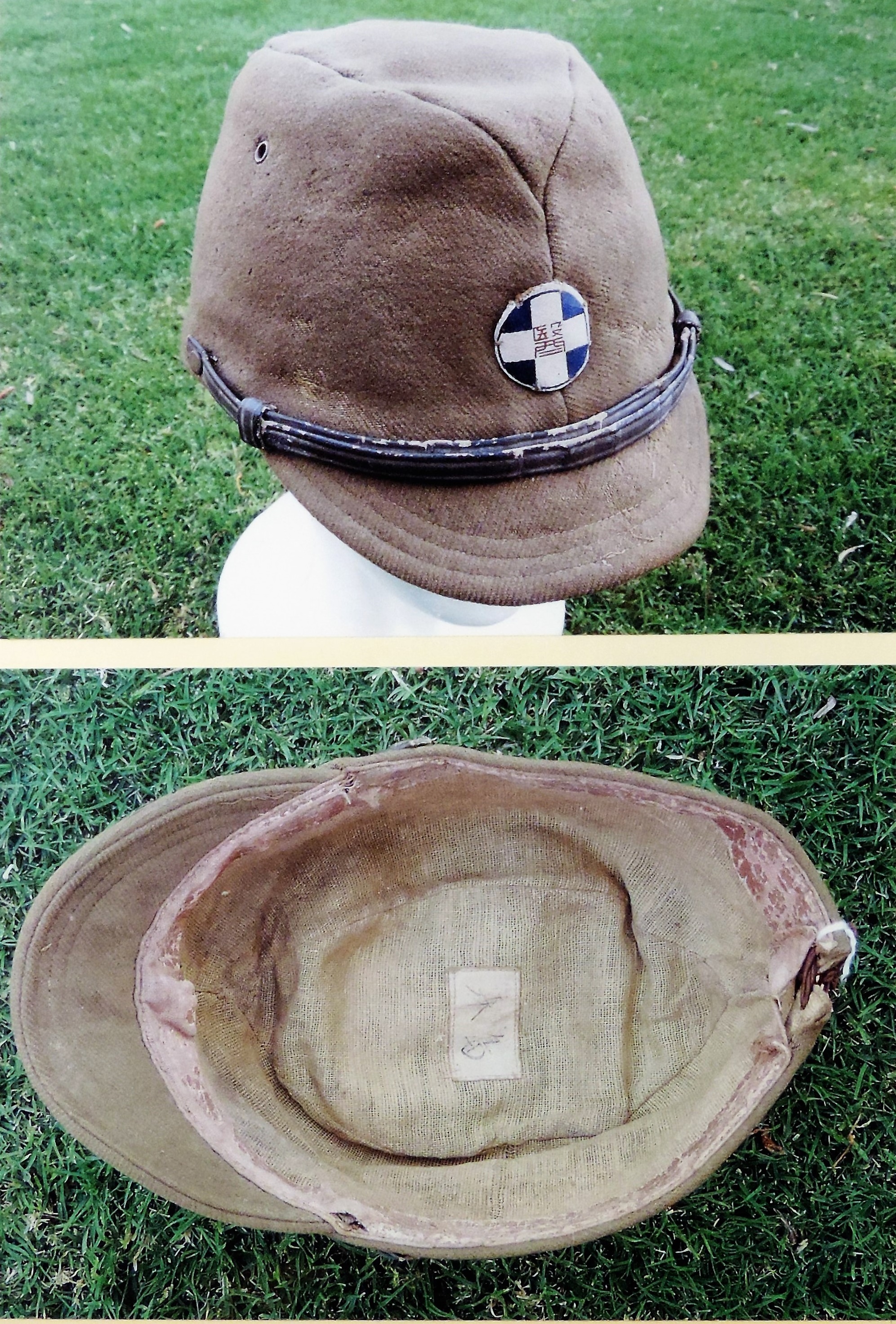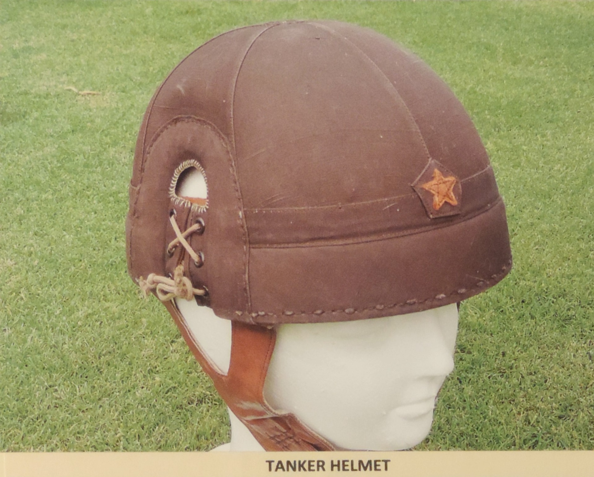 The field cap is made of olive-drab woolen cloth and is generally the shape of the head, with a narrow visor of the same material and a brown leather chin strap. It has a star along the vertical front seam. This cap may be worn under the helmet.