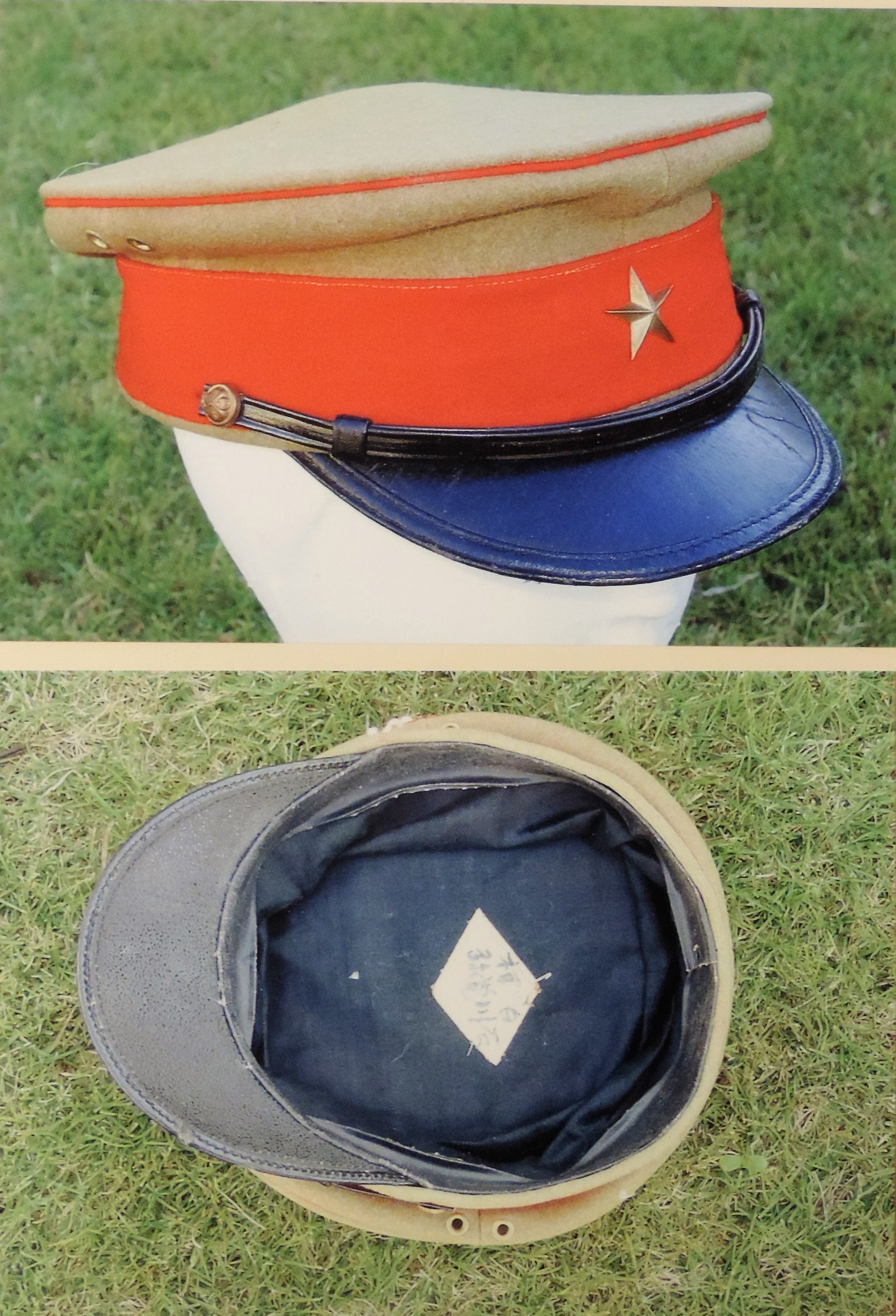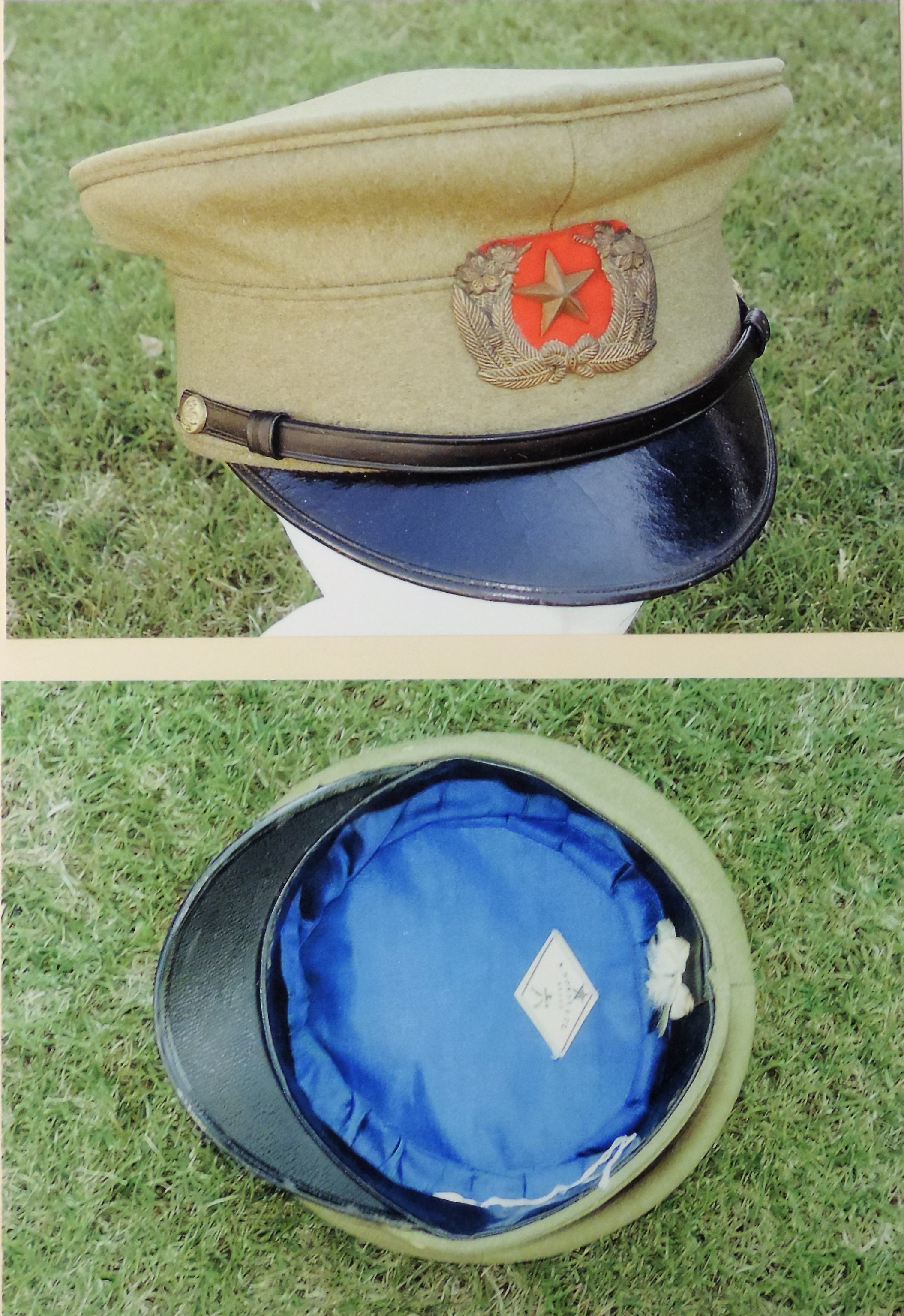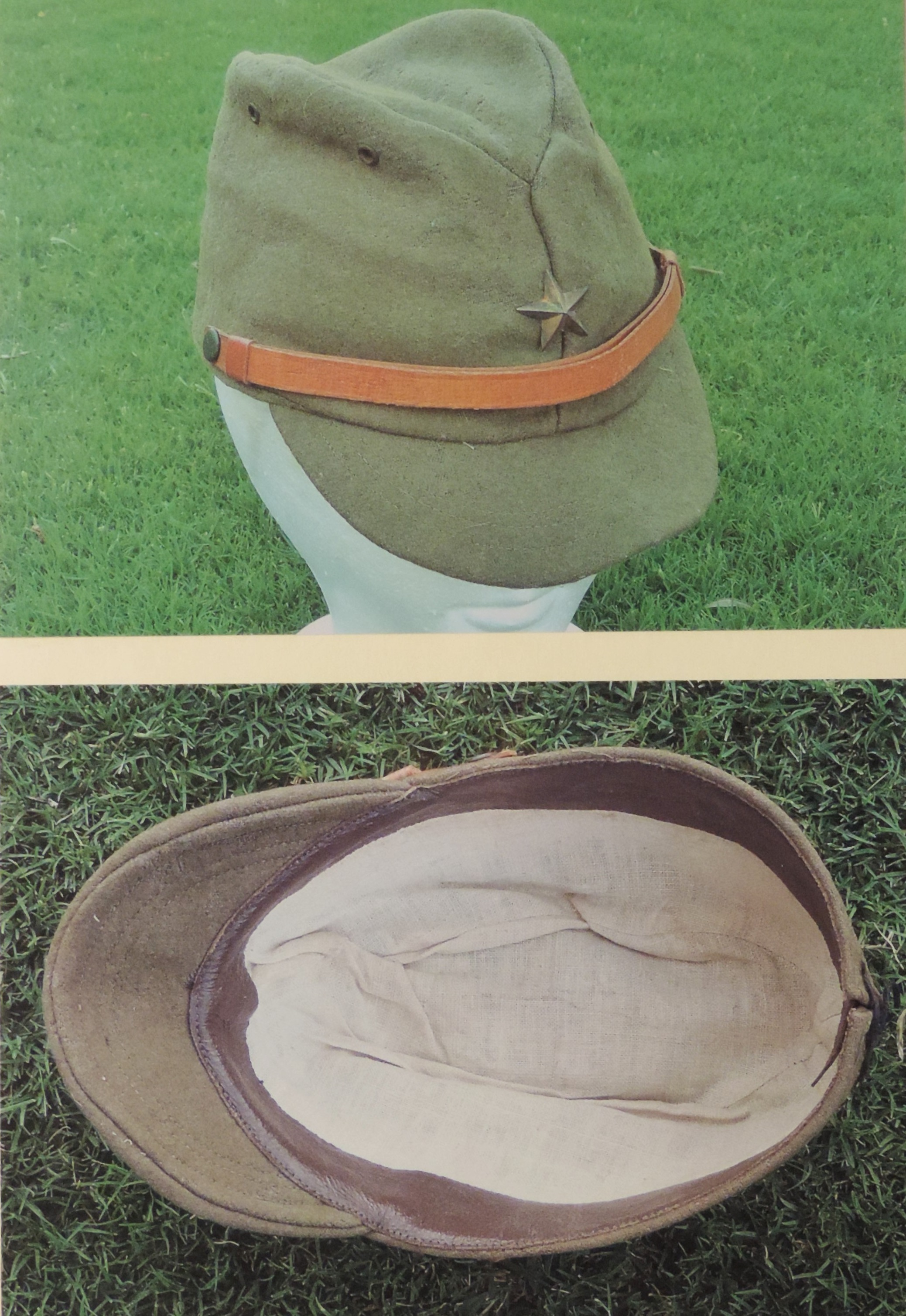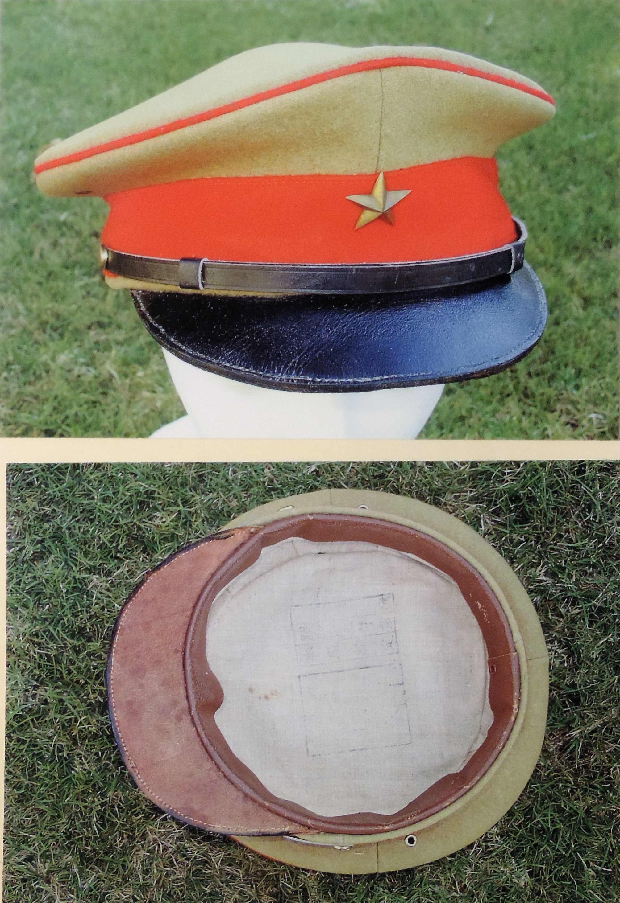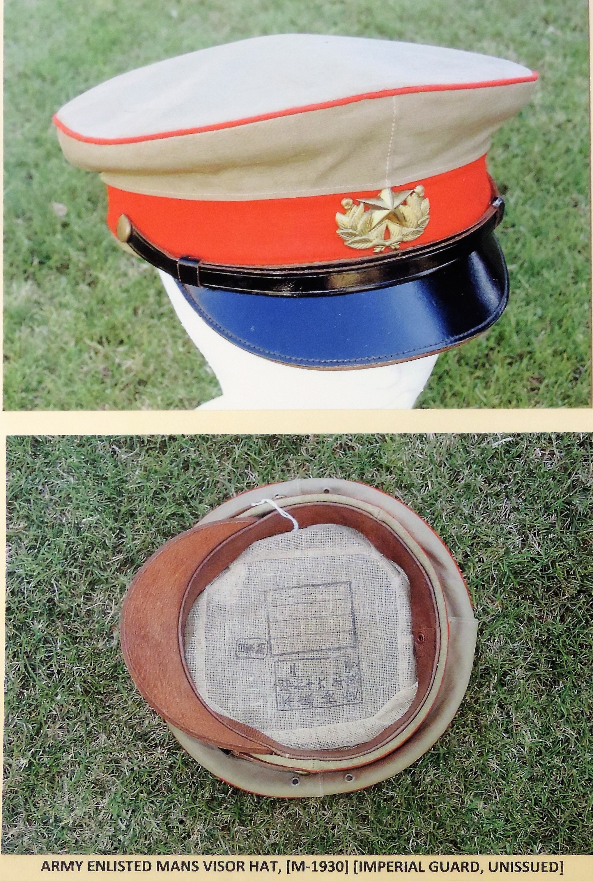 The service cap is olive drab in color and similar in shape to that of the United States Army, but it has a smaller crown and shorter visor. A red piping is inserted at the outer edge of the crown and the headband is encircled with a strip of red felt about 1 ½ inches wide. At the front of the headband is a gold star. For officers and men of the Imperial Guards a semicircular wreath of leaves is fastened just below the star. The visor and chin strap are of black leather in standard military design.