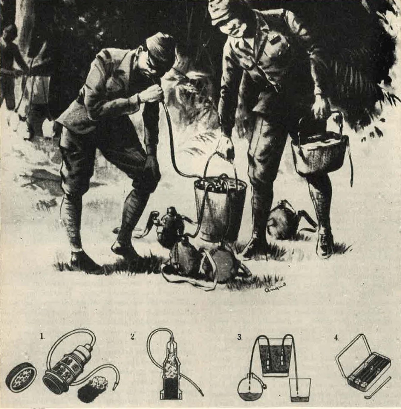 Some of these are made of heavy duck. Others were formerly tnade of leather or a combination of duck and leather, but now a rubberized fabric, not unlike the material used in belting, is being substituted for leather in all field equipment. This new fabric actually has certain advantages, especially in wet tropical regions where leather deteriorates rapidly. Aside from these special bags, many boxes or bags used by the Japanese soldier are designed for ease in carrying.