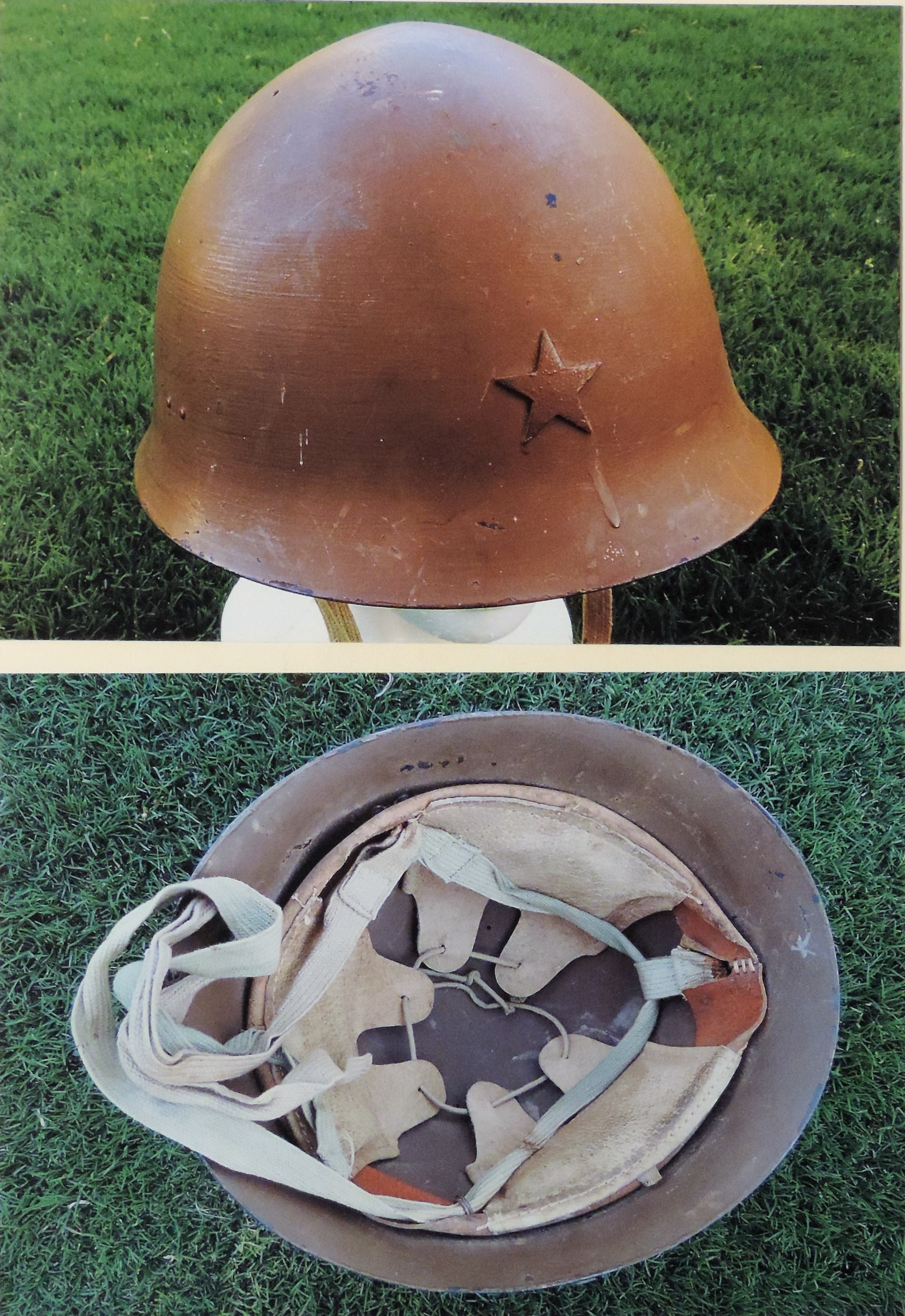 Steel helmets are generally worn during combat. Webbing tapes tie under the chin or at the back of the neck. The star insignia also are worn on metal helmets. The steel is of inferior quality and the helmets are easily pierced or shattered.