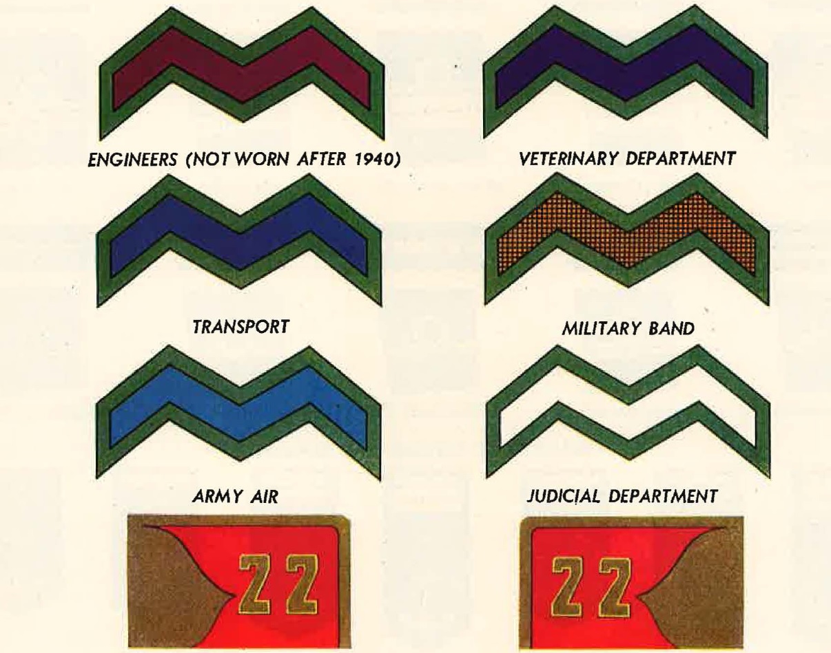 Commanders of infantry often will wear some special insignia, such as crossed sashes of dark color, to enable their men to distinguish them. Recruits wear a white patch, sewed or pinned on the left breast of coat or shirt, on which is written their name and unit. In combat areas, all enlisted men may wear such a patch eontaining general information and occasionally, some mark of rank.