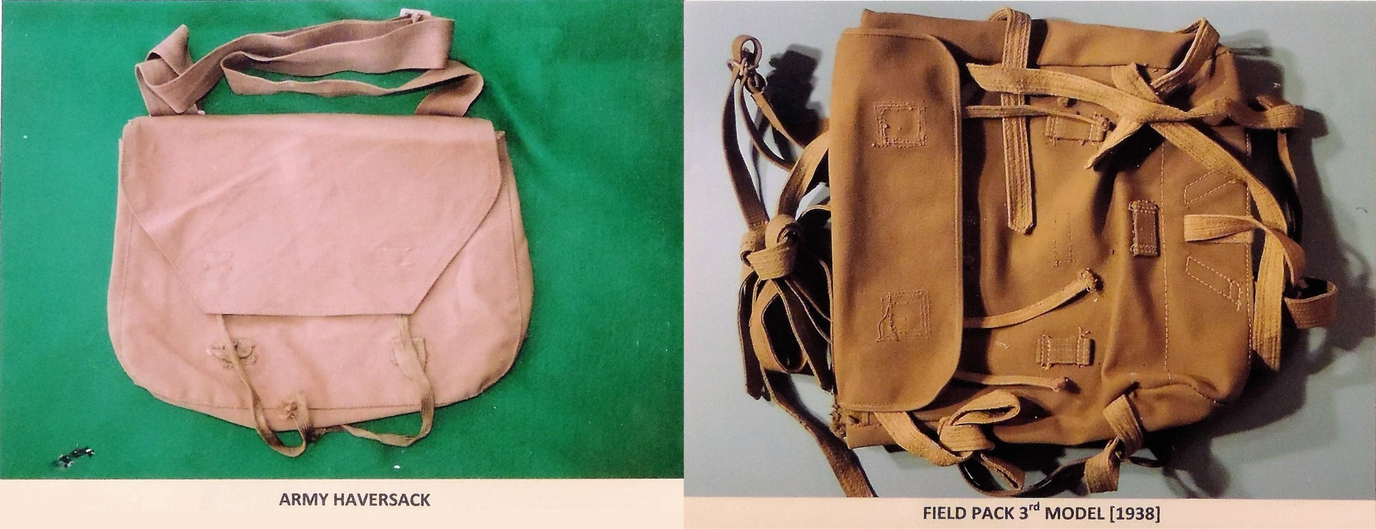 The Japanese have several types of pack, the commonest now is a sack of heavy duck about 13 inches square and 5 inches deep. This is believed to supersede the older pack which was made of cowhide with the hair on. The noncommissioned officers' pack is slightly smaller; a type of officers' pack, with a leather backing is even smaller.