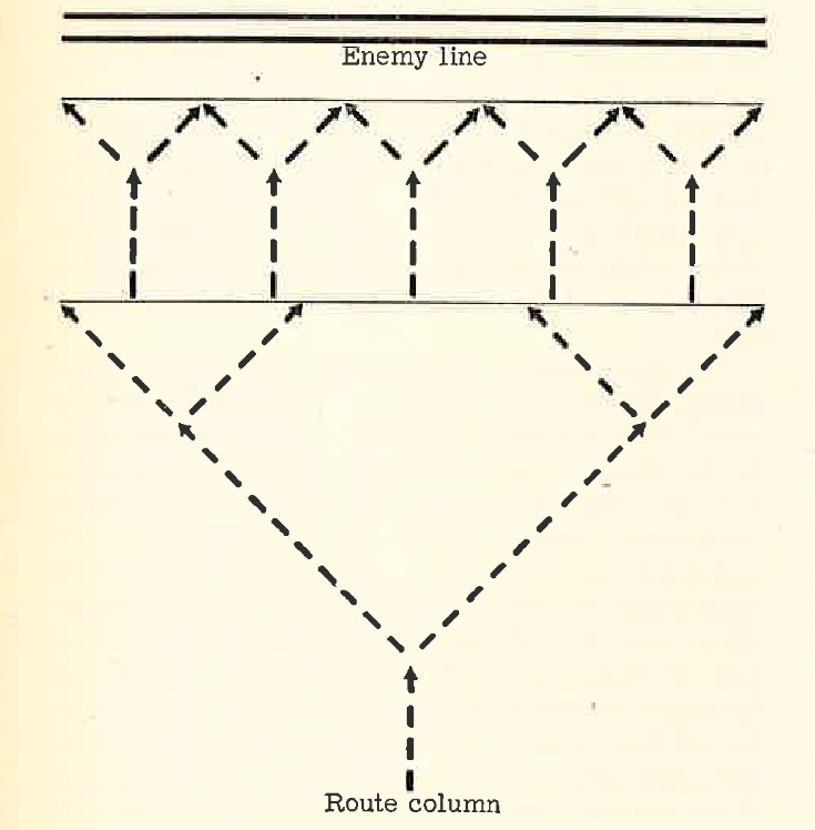 (a) The force advances in two or more parallel columns, with one or more columns directed toward the enemy flank and rear during the advance to contact.