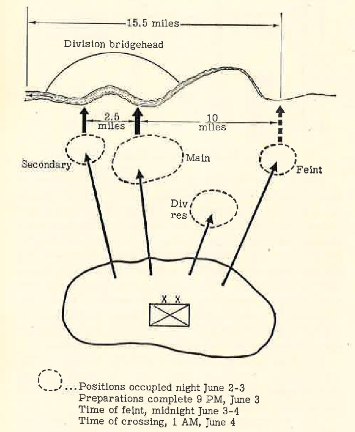 (b) The advance guard commander, bearing in mind these general functions, is expected to exercise initiative and boldness of action in specific cases. He obtains the necessary information by vigorous patrolling and, if necessary, by a small-scale attack. He protects the deployment of the division, either by offensive or defensive methods, and attacks when necessary to obtain important geographical points. Left to his own devices, however, the advance-guard commander usually elects to drive headlong into the advancing enemy, unless specifically restrained by division order.