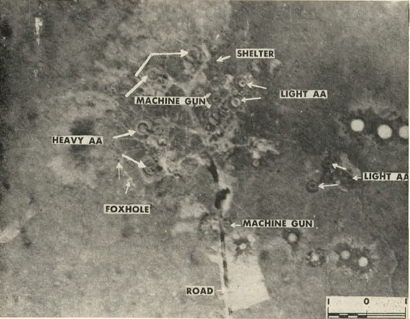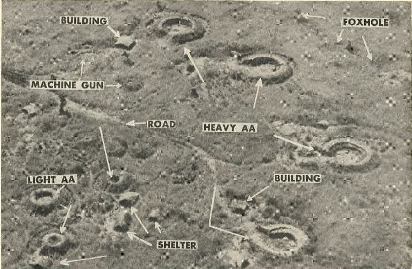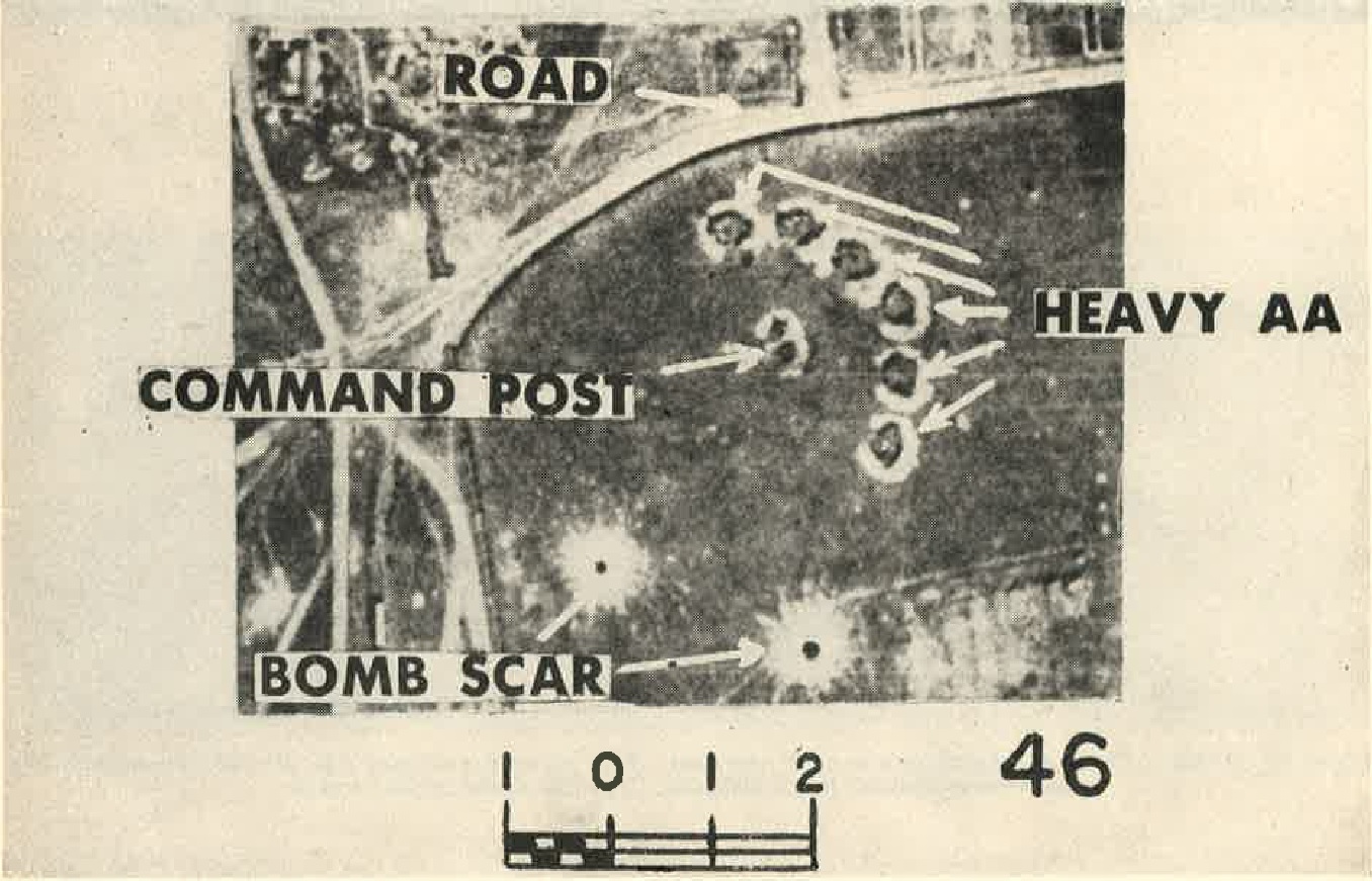 Figure 89. Four Gun Heavy Antiaircraft Battery (Emplacements Empty). Emplacements are built of earth over which grass has grown. Pattern is a shallow arc with fire control installations in center. A three gun light antiaircraft and a two gun light antiaircraft are also present. The large emplacements could house 75-mm or 105-mm guns. The small emplacements are probably for heavy machine gun or 13-mm antiaircraft.
