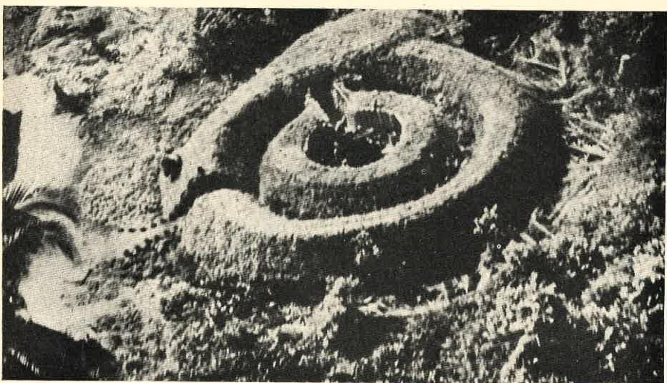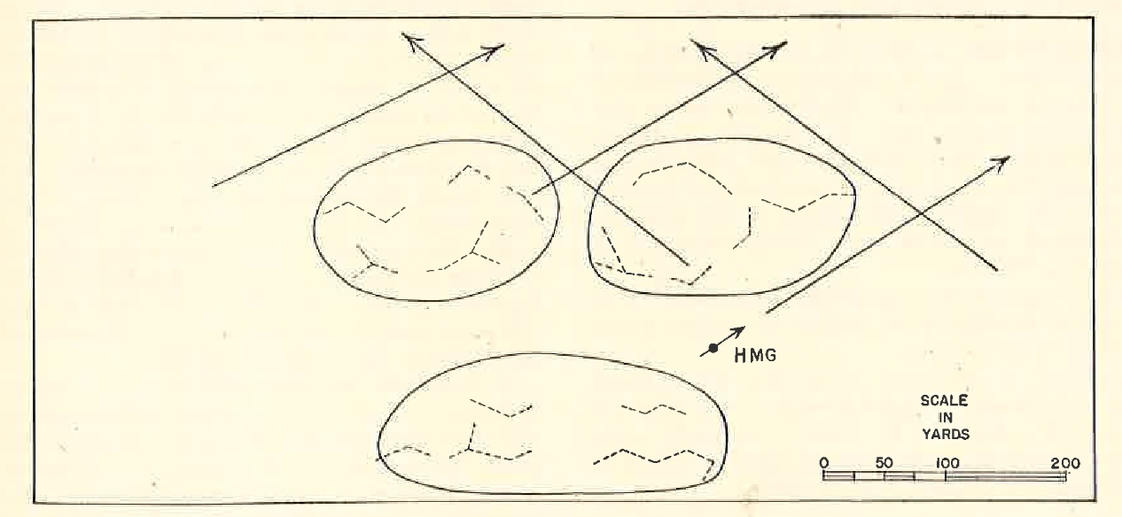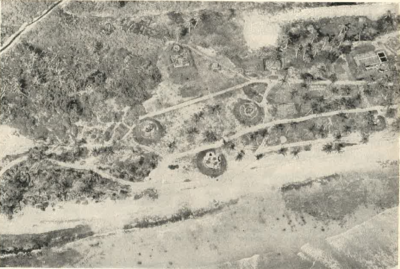 Figure 89. Four Gun Heavy Antiaircraft Battery (Emplacements Empty). Emplacements are built of earth over which grass has grown. Pattern is a shallow arc with fire control installations in center. A three gun light antiaircraft and a two gun light antiaircraft are also present. The large emplacements could house 75-mm or 105-mm guns. The small emplacements are probably for heavy machine gun or 13-mm antiaircraft.