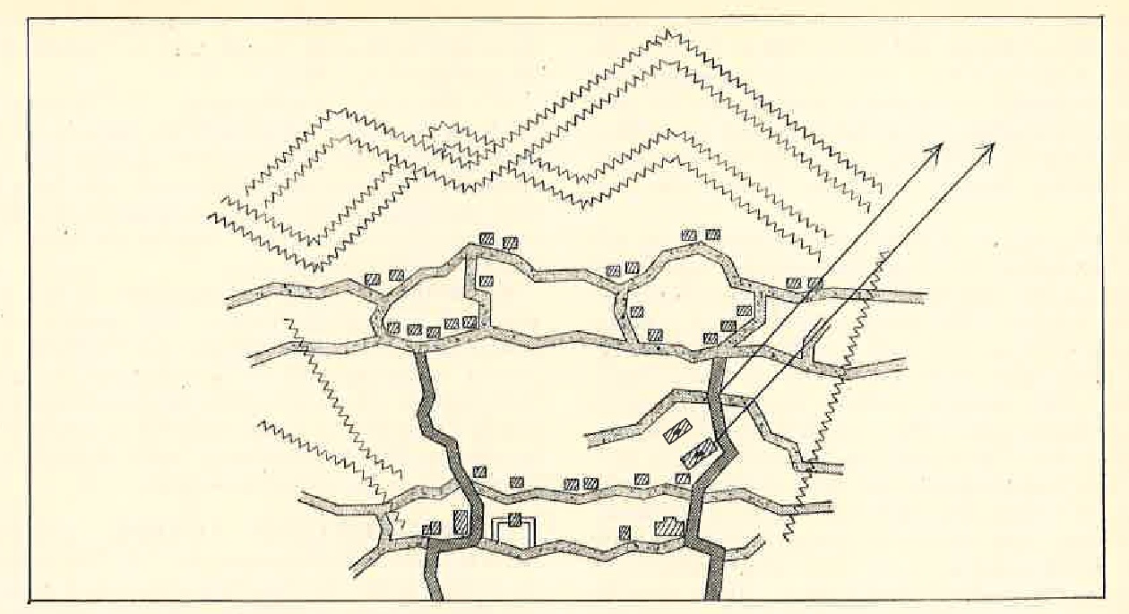 The whereabouts of the remainder of the division is not known. The above illustration is taken from a British source which states that the initial advance of the division was made by 2 regiments, i. e., 6 battalions, spread over a frontage of 40 miles. The 3 columns were divided. with approximately a 20- mile space between each. In this case the left column hardly could be considered as self contained. Use was made of roads, trails, and waterways wherever possible. In advance in 3 columns, the division commander remains the commander of the strongest column. More than 3 columns may be found, but such employment will be exceptional.