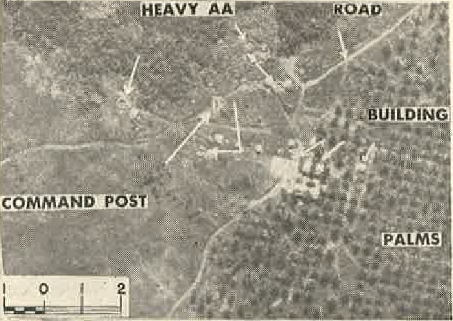 Figure 90-91. Note the rough trapezoidal pattern this four gun Heavy 75-mm Antiaircraft Battery. The command post is centrally located. This pattern is used most often at permanent, strongly established Japanese bases. The emplacements are shallow excavations with thick, strong revetments.