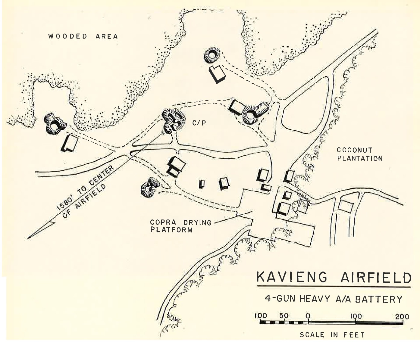 (1) Japanese antiaircraft companies· observed are usually situated within a 1-mile radius around the area to be defended, with the greatest concentration of guns between the defended areas and the sea approaches thereto, along shore lines, and in the direction of enemy territory. Guns are mounted both in single positions and in batteries of from 2 to 12 guns. The distance between guns in both heavy and medium companies varies from 40 to 250 feet, with the majority of revetments between 50 and llO feet apart. Machine guns usually are placed either within the group or a short distance from the group for protection against low flying aircraft.
