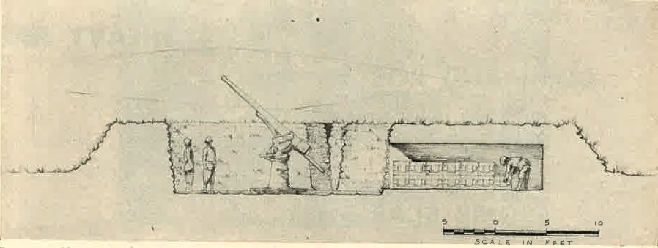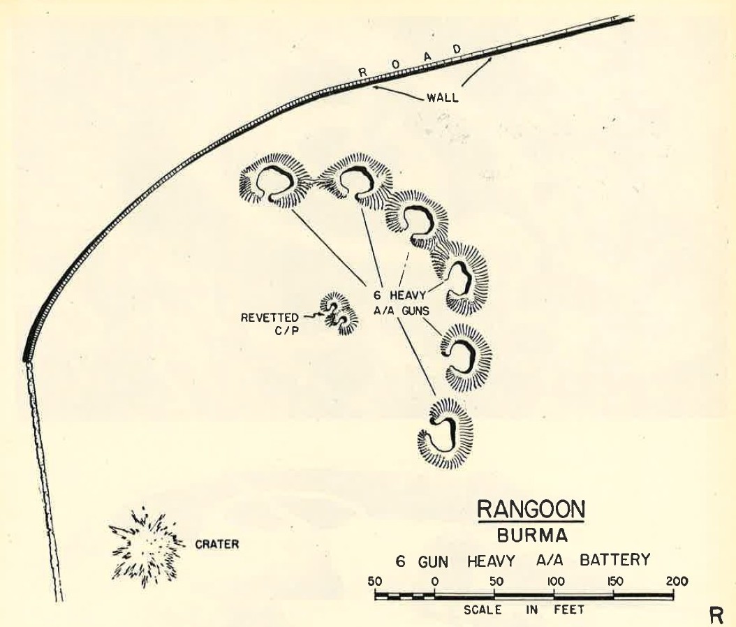 Figure 93. Skeych of 75-mm antiaircraft gun in earth revetment. Note partially excavated type of emplacement with high revetment and built-in Ready Magazine. Note also zigzag entrance trechs.