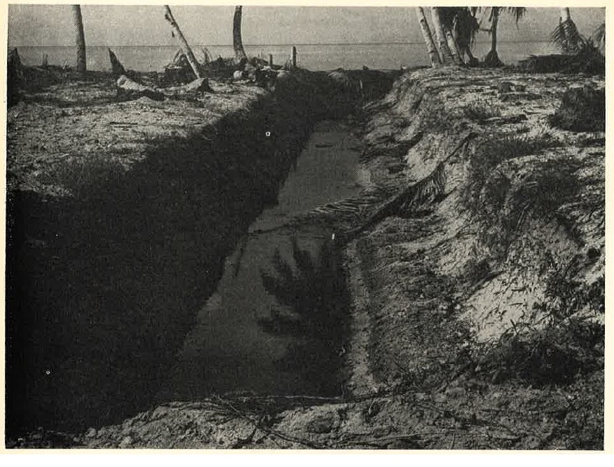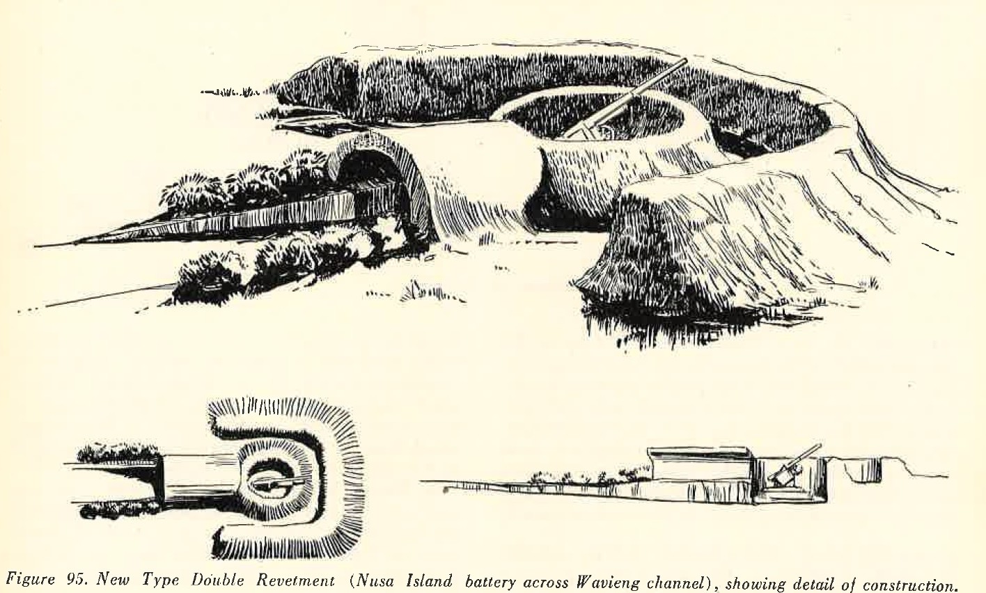 The standard type of gun emplacement used almost exclusively is of circular or semi-circular construction, either level with the surface of the ground or slightly dug in. It is surrounded by a revetment built up of logs, coral, sand bags, and other materials to protect the gun and its crew. The opening usually is protected by a blast wall. A variation of this type of emplacement is constructed with two concentric circular revetments. (This type is commonly called the "doughnut.") The almost rigid adherence to these types of emplacements makes them readily identified from the air. Recently more care has been taken to conceal them by decreasing the slope of the revetment and planting it with natural growth so that shadows will not be so apparent.