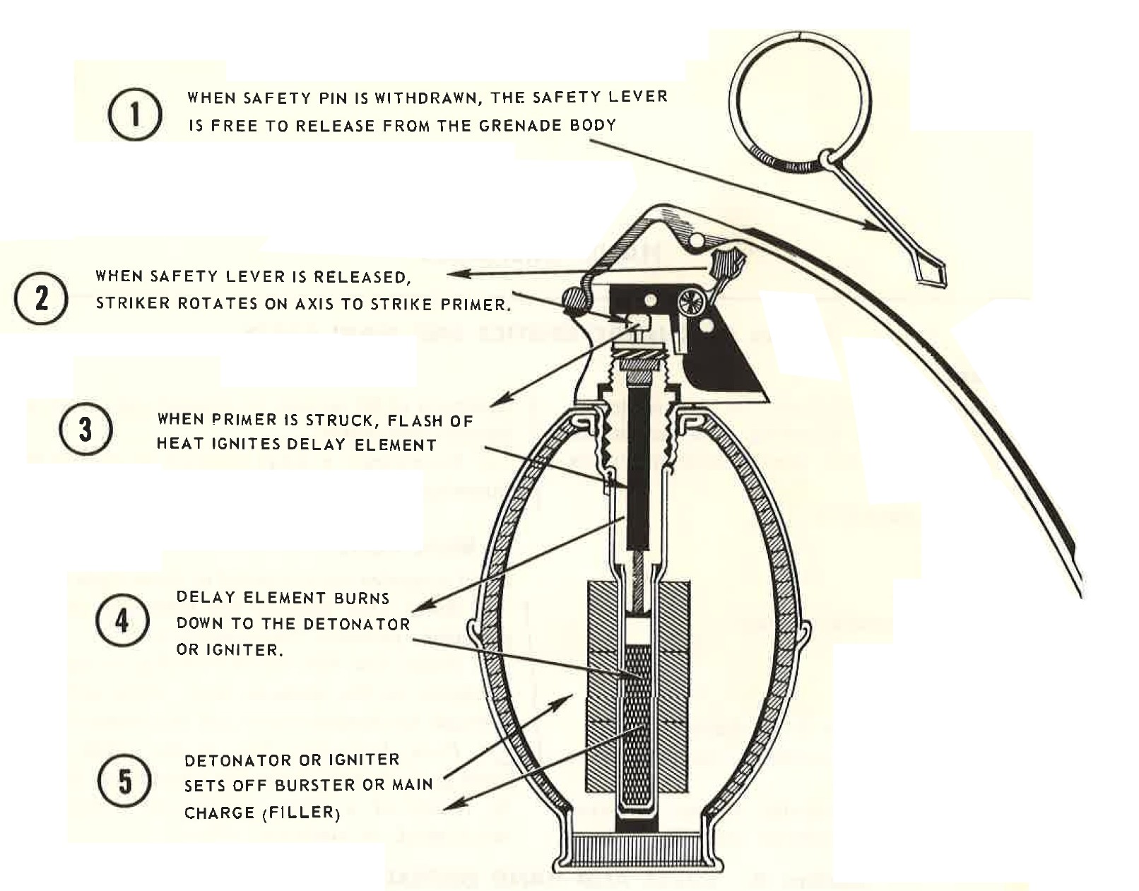 All fuzes in U.S. hand grenades, during the Vietnam war, may be categorized either detonating or igniting. With few exceptions, fuzes function in the following manner: