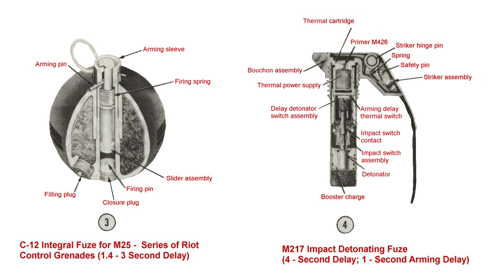 c. C12 integral fuze (3, figure 4). This fuze is an integral part of teh M25-series of riot control hand grenades. The fuze consists of a firing pin which is screwed into the base of the grenade body, an arming sleeve, and a slider assembly. The slider assembly contains a delay element of 1.4 to 3 seconds and a small detonator. When the safety pin is removed, the arming sleeve is held in place with the thumb. When the arming sleeve is released, the slider assembly is forced downward toward the firing pin under pressure of the firing spring. At the bottom of the fuze well, the slider strikes the firing