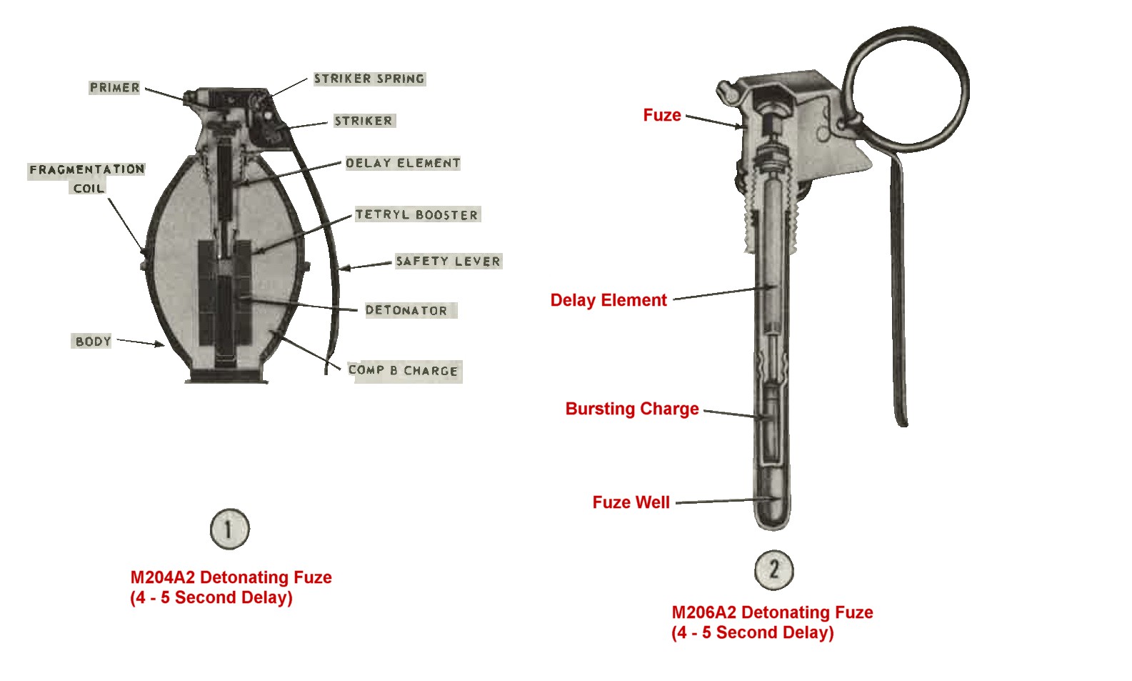 a. M204A1 and M204A2 fuzes (1, Figure 4). These fuzes are used with the MK2, the M26, and the M26A1 fragmentation hand grenades. The fuze well accepting these fuzes will also accept any standrad firing device or the shipping plug priming-adapter of teh M18A1 antipersonnel mine (Claymore). Each fuze functions as described in paragraph 6. The delay element is a power train requiring 4 to 5 seconds to burn down to the detonator. The detonators sets off the filler.