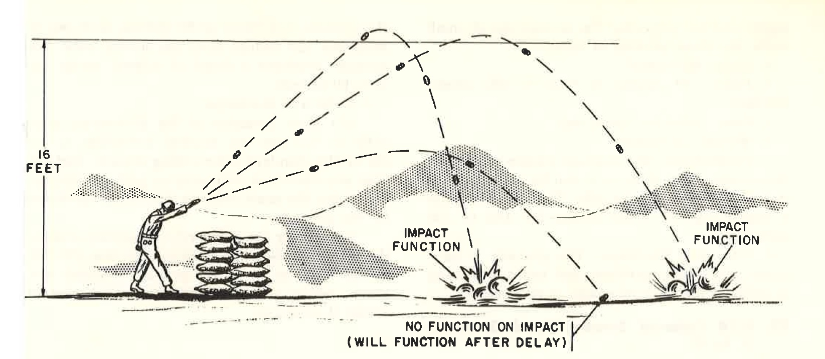 Figure 4. Detonating fuzes. (2) Grenades armed with the M217 impact detonating fuze must be thrown to a minimum height of 4.5 meters (16 feet) (Figure 5). This height gives the grenade enough flight time to expend the 1 second arming delay and allows the grenade to detonate on impact. The grenade will detonate on impact when the arming delay is expended, regardless of teh angle at which it strikes a target. If the grenade impacts before the arming delay has elapsed, or if no impact occurs after release of teh safety lever, the grenade will detonate after a delasy of 4 seconds.