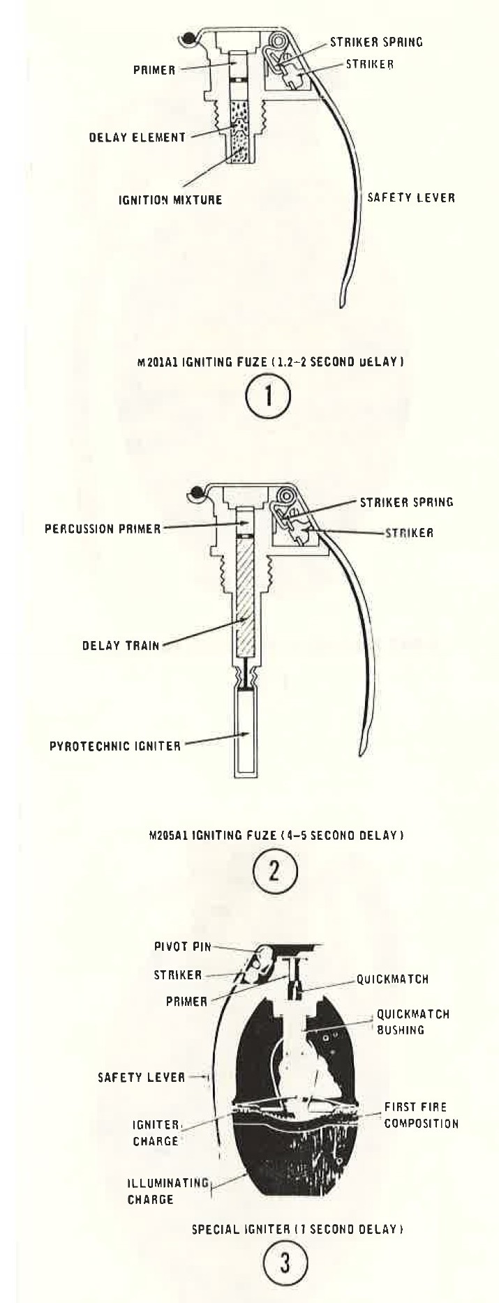 The M201A1 fuze is interchangeable with any standard firing device. The fuze functions as described in paragraph 6. The time delay element is a powder train requiring 1.2 to 2 seconds to burn to the igniter. The igniter ignites the filler or a pyrotechnic starter with a violent burning action and causes the filler to be expelled from the grenade body.