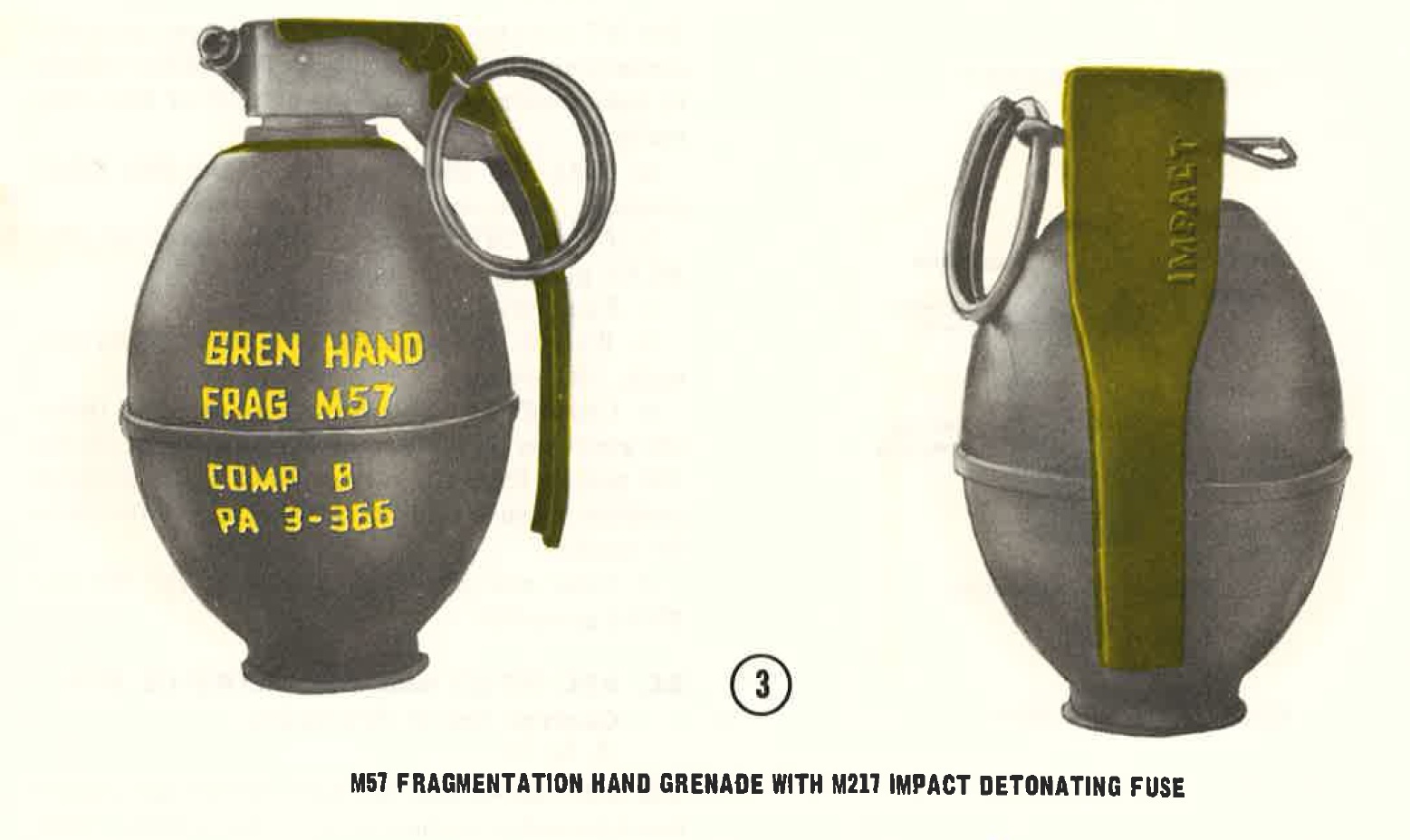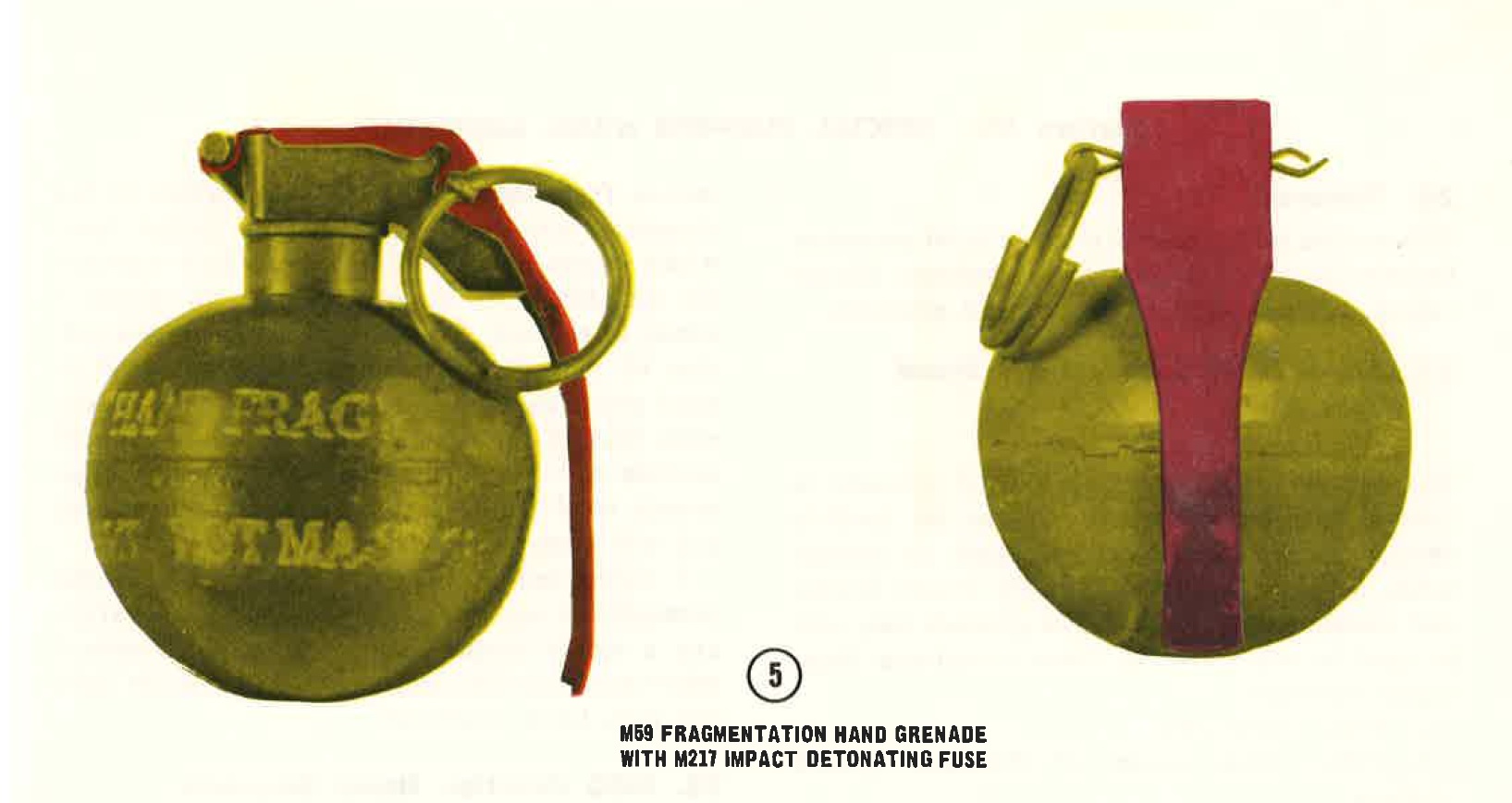 e. M217 fuze (4, figure 4). This fuze is used with the M59 and the M57 fragmentation hand grenades. The M217 is an impact detonating fuze which functions by electrical means. The purpose of the fuze is to provide immediate detonation on impact, to prevent the grenade from being thrown back by the enemy, amd to prevent the grenade from rolling away from targets located on sloping terrain. The M217 fuze can be distinguished from other types of fuzes by the word IMPACT embossed in raised letters on the red safety lever.