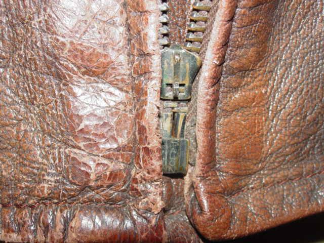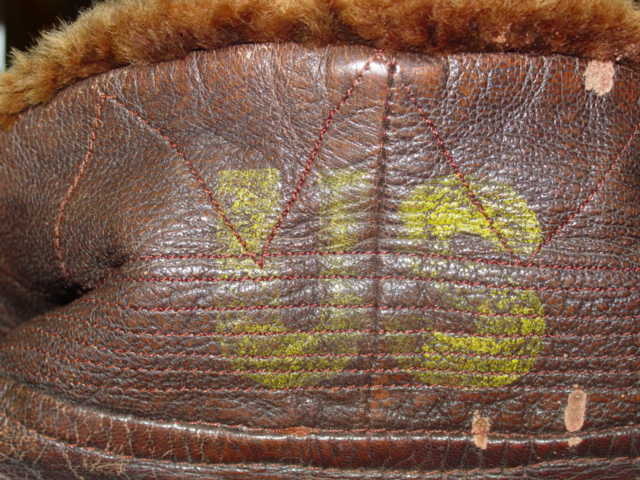 shut by flaps with buttons.  Furry collar.  Type G-1.  The back of the collar has the initials