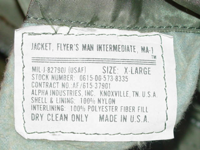 mimics the Air Force jacket but was not made for military consumption. Of nylon construction. Type