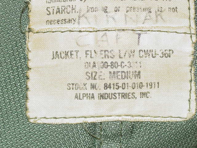 This is a US Air Force flight jacket. Of nylon construction. Dated 1980. White tag with black