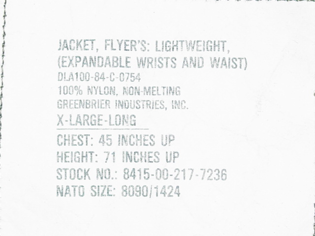 This is a US Air Force jacket. Lightweight type. Of nylon and cotton construction. Dated 1984.