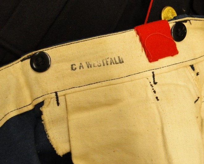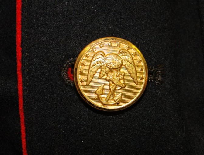 Bkue Dress "A". features a midnight blue coat with standing collar. The enlisted version (shown here) includes seven gilt buttons and red trim