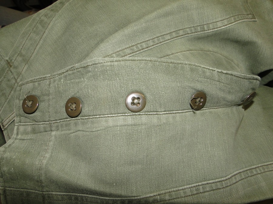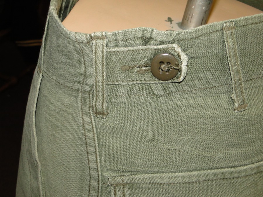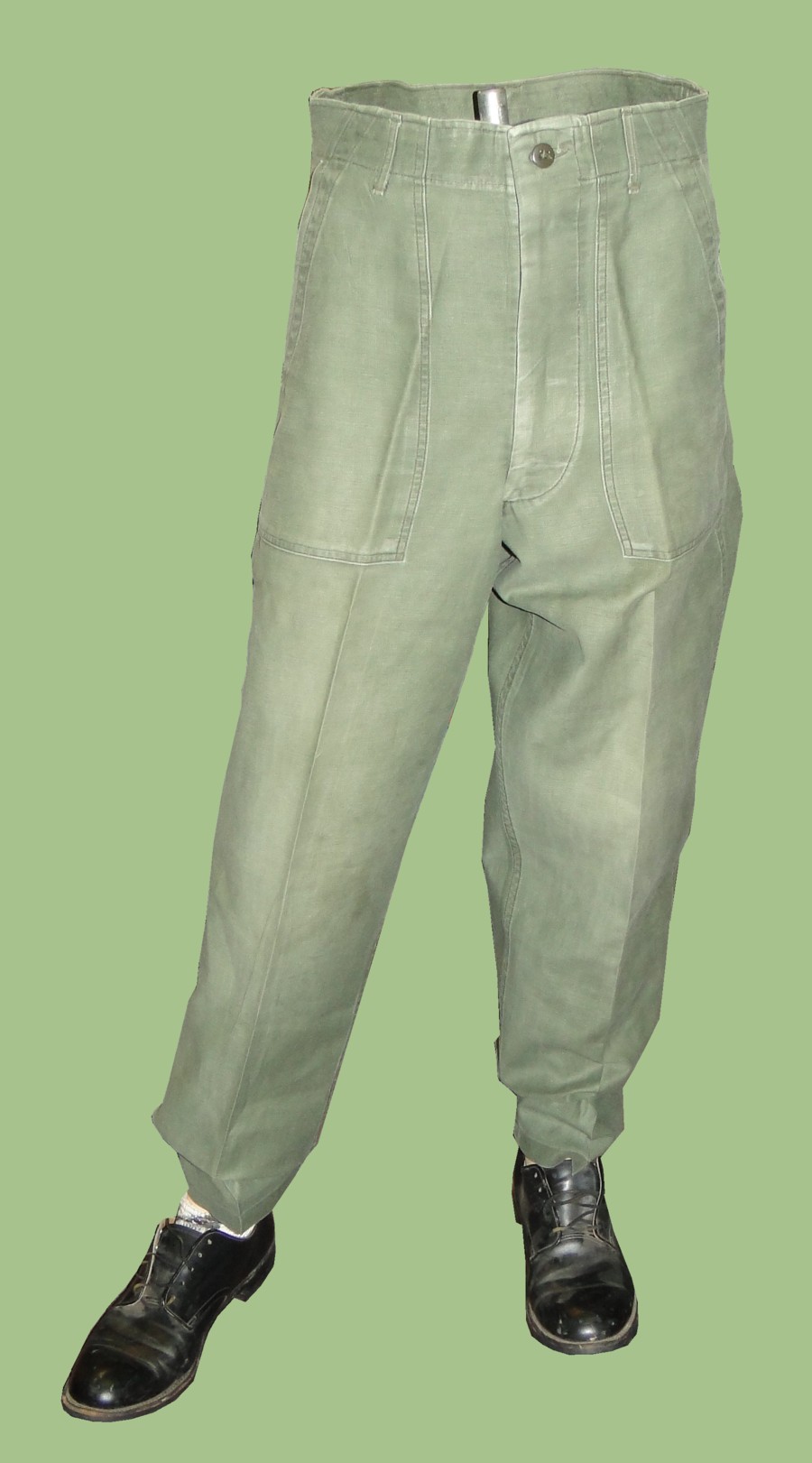 The uniform shown here is an example of the type used during the Korean war. The waist has a series of cloth belt loops sewn in place. The top front is secured by a green plastic button. The waist is adjustable via the use of a cloth strap and a button. This limits the adjustment to a single position. The legs are straight and have no adjustment.