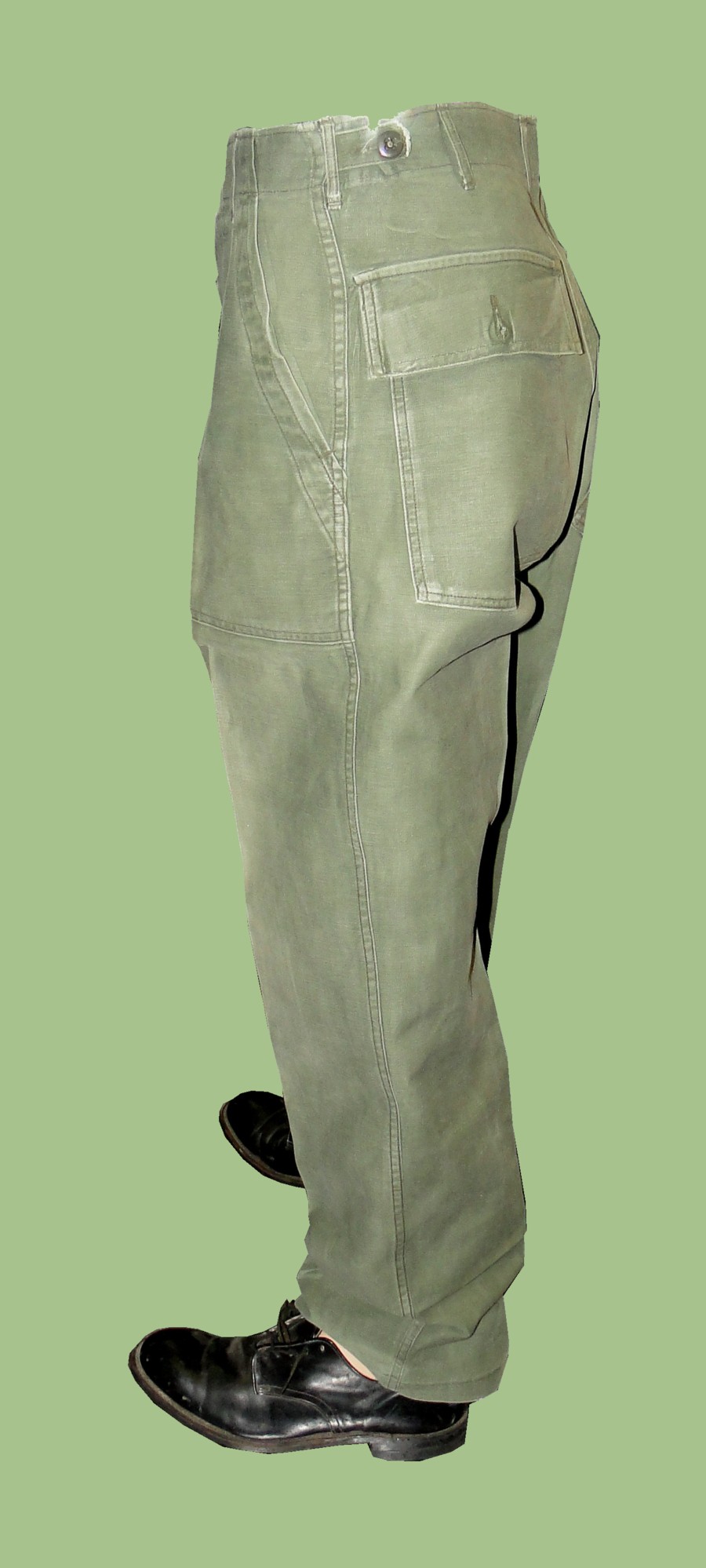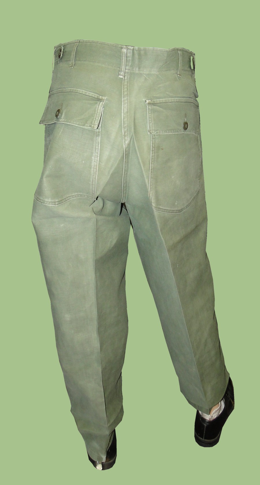 Korean War US Army Sateen pants - This is a set of US Army sateen pants. As used during the early 1950's. Of cotton construction. Olive drab color. The design came straight from WWII. Two front pockets. Button up fly where the buttons are plastic and green in color. The same basic set of pants was used clear until the 1980's. Two pockets are found in the back. These have a closure flap secure by a button.