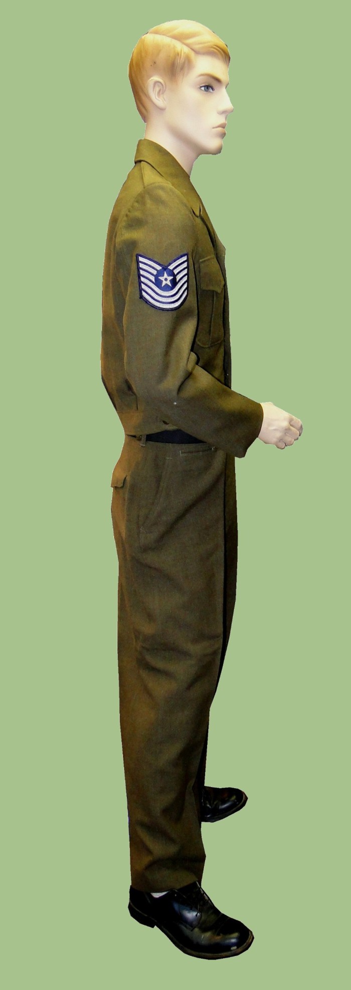 This is a 1955 US Air Force uniform. Consisting of an Ike jacket and pants. Of wool and Nylon construction. Olive drab color.