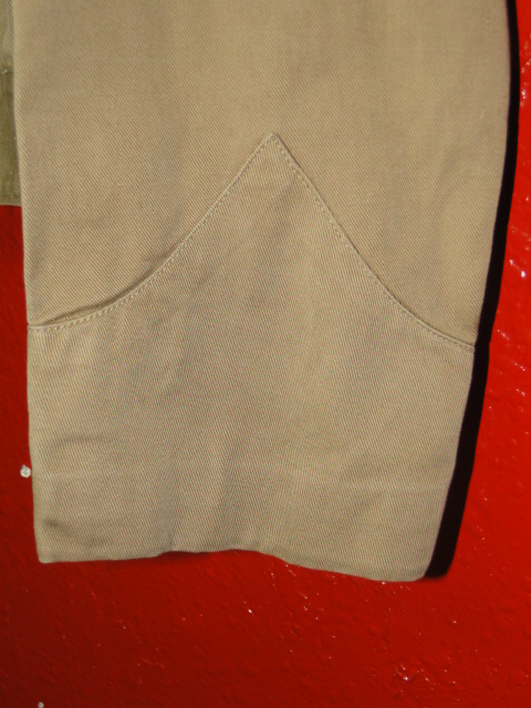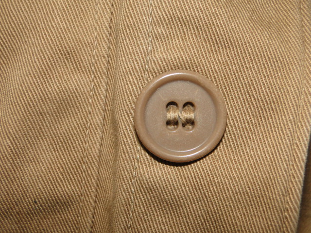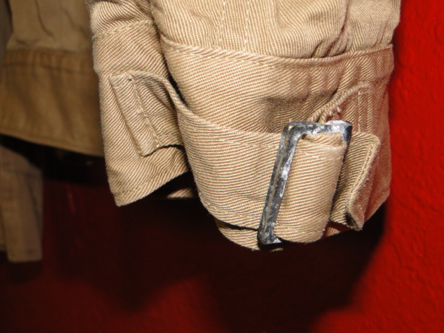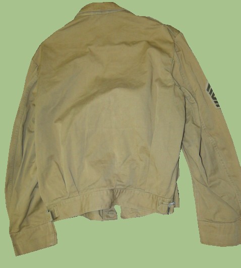 This is a US Marine Corps (USMC) jacket. Known as the Vandergrif. Very similar in construction to the Ike jacket. Of heavy cotton construction. Two pocket design with flap covers. Adjustable waist. Eppaulets on the shoulders are sewn to one end and secured by a button on the other. Long sleeves with scalloped ends. Rank patches found in each arm. The front is closed by a series of Khaki colored plastic buttons. The original tag remains in place but is no longer legible. This tunic was only used in for a couple of years after the end of WWII.