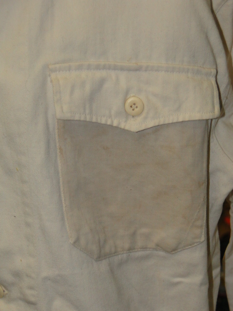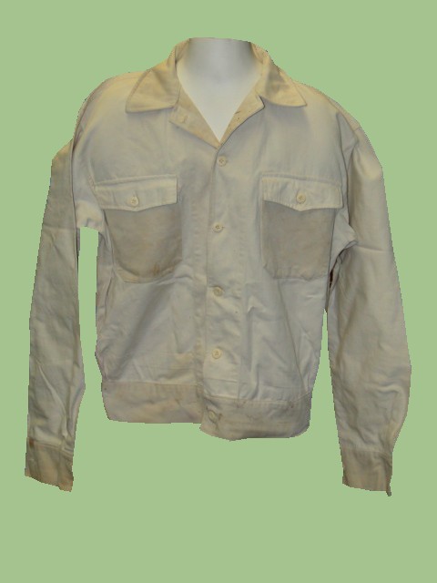 This is a 1945 - 1946 US Navy (USN) tour jacket. Of white cotton construction. Two pockets in the front. White plastic