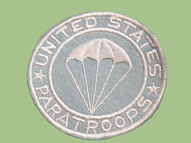 This is a US World War Two patch. This patch was not standard issue but rather it could be purchased from tha PX at the base. It came in two different sizes and about three colors. The design consisted of the image of a deployed parachute with the words "united States paratroops" written in the perimeter.
