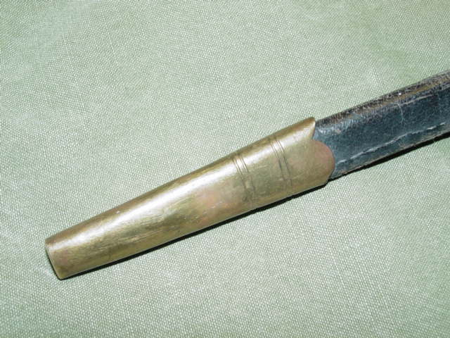 The scabbard is made of leather with brass ends. The upper section has a hook designed to connect to a leather frog,