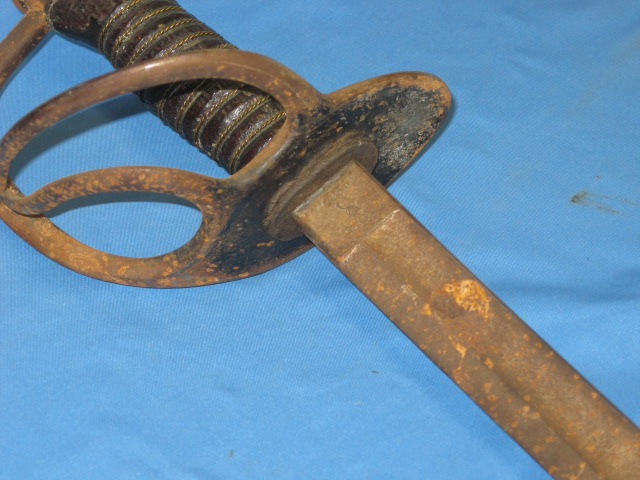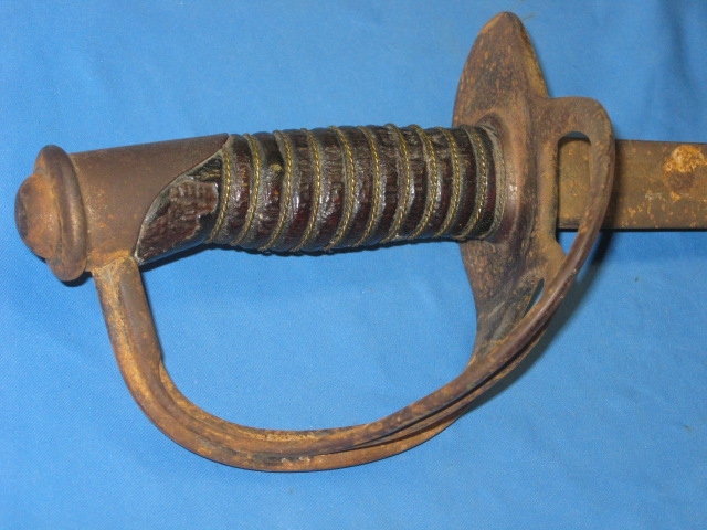 This is a US Army officer sword. The handle is leather covered. Twisted wire wrapping is nicely done and remains in
