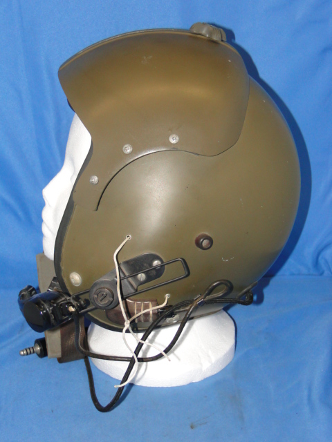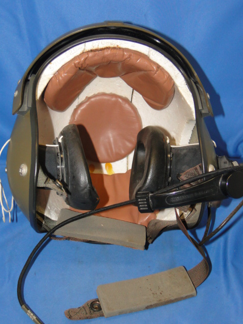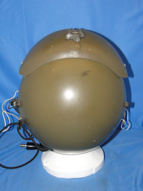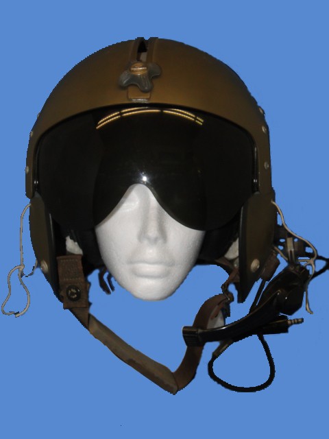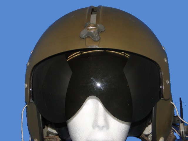 This is the standard helmet for helicopter pilots during the Vietnam war. The shekk is of lightweight constreuction. A smoked visor could be placed down to cover the pilot's face.