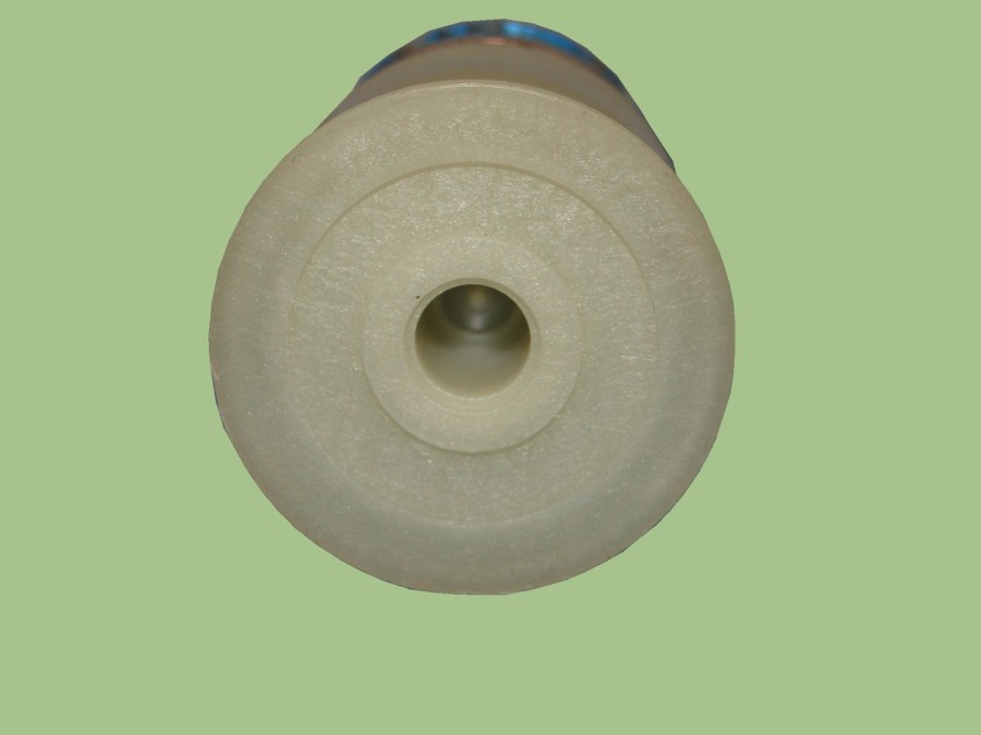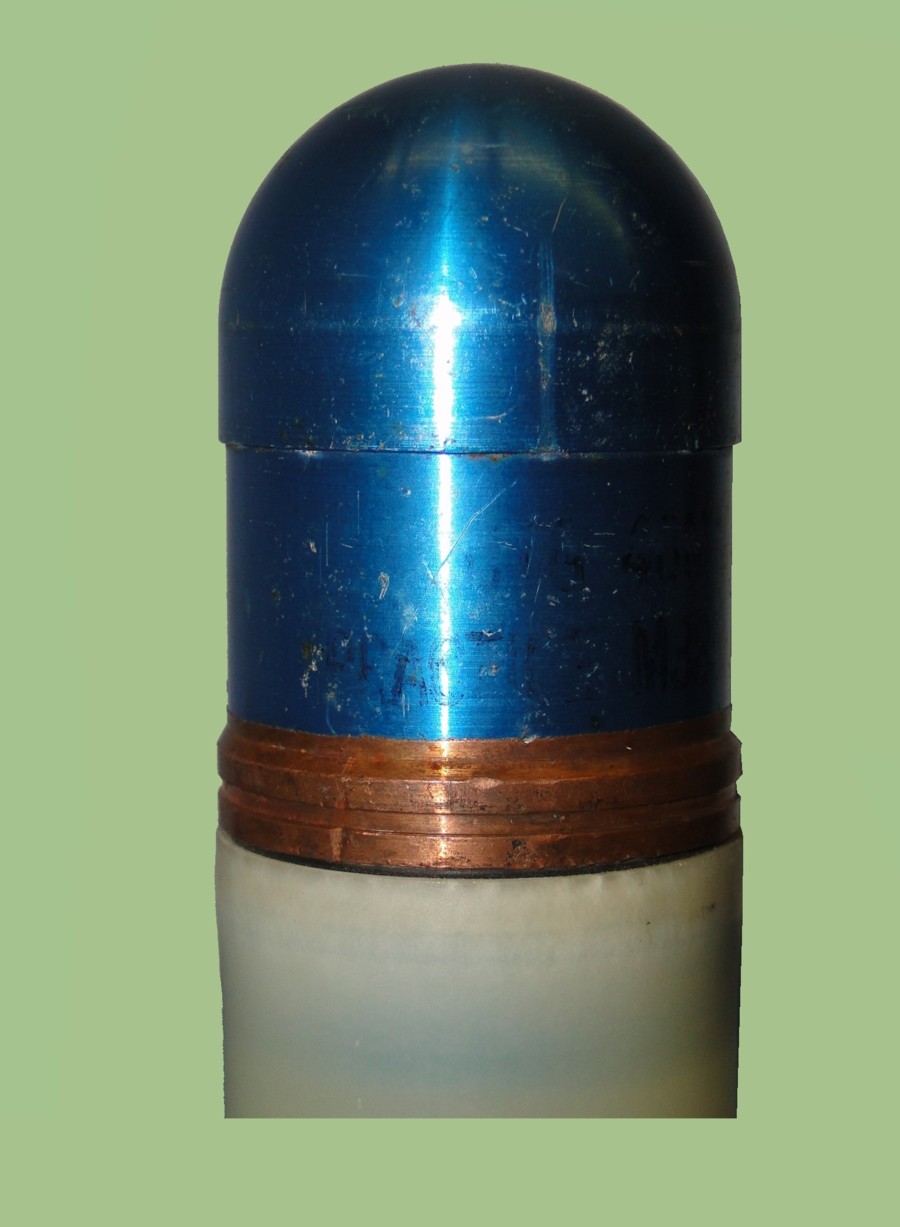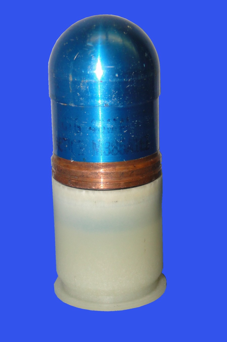 This is a grenade employed in the training of soldiers. Plastic body. Blue metal tip.