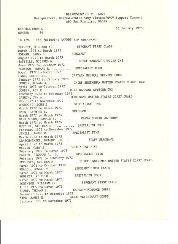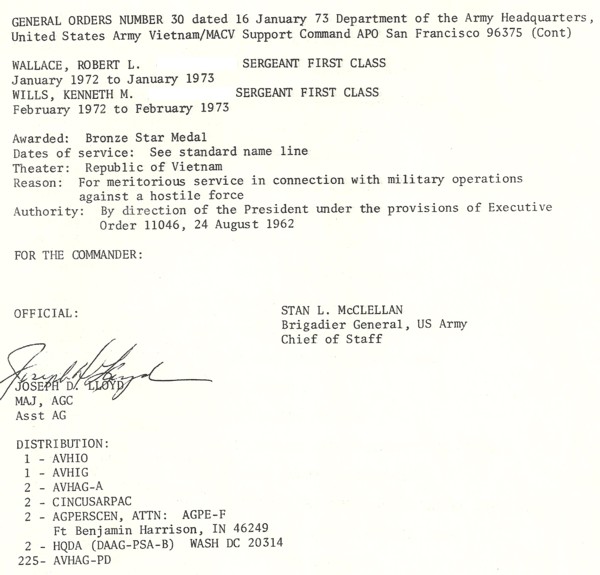 1973. It was issued by the department of the army under General Order number 30. It was signed by Brigadier General