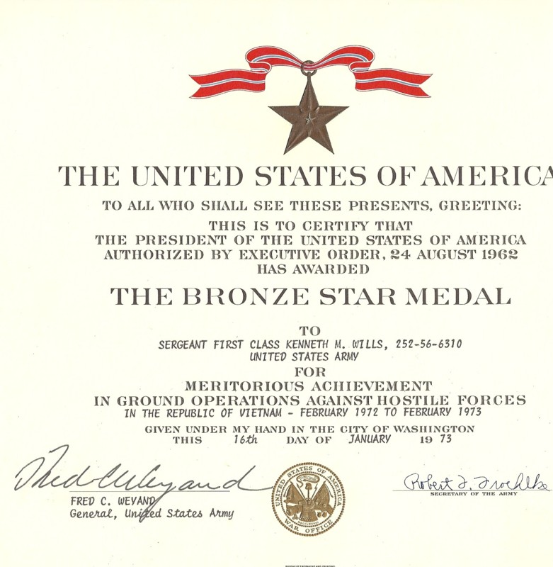 The Bronze Star citation states that the medal was issued for "Meritorious achievement in ground operations against