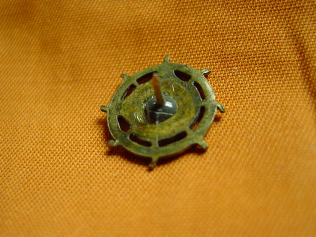 The design consists of a ship's wheel with a shield in the center. A wheel is located in the